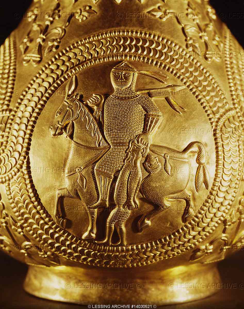 На амфоре из сокровищ обнаруженных в Наг-Санкт-Миклош изображен всадник с защитной части предплечья и икры. Они состоят не из одного листа, а отдельных металлических полос прикрепленых к основе – коже или ткани. Данная защита относится к временам Каролингов известна с VIII века2