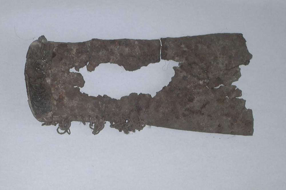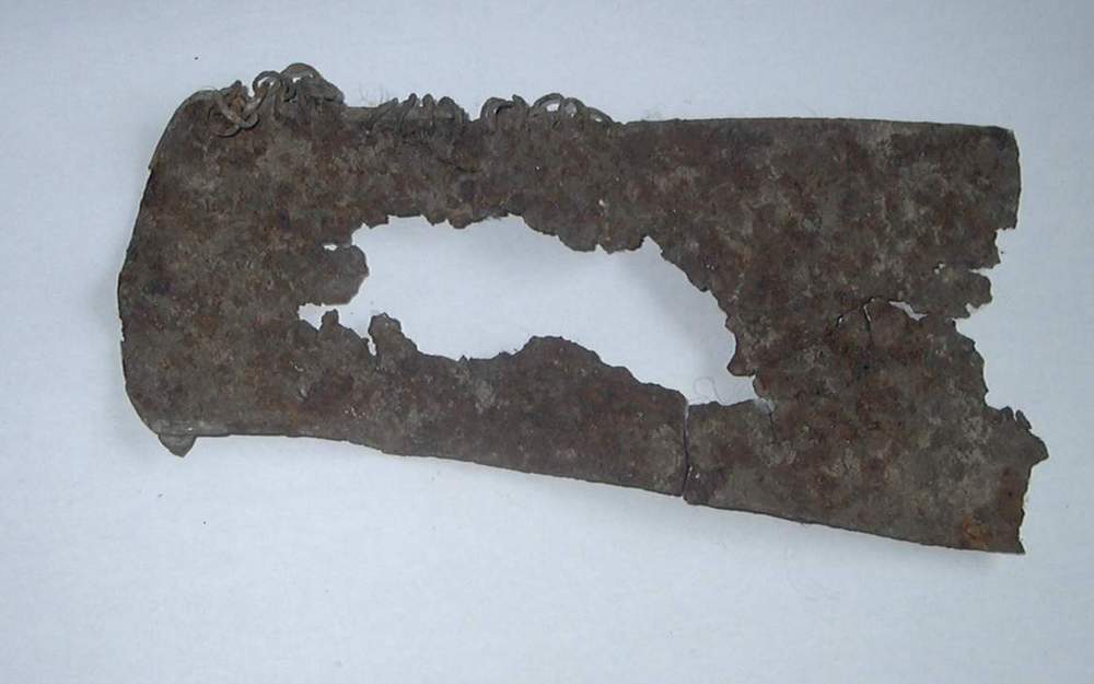 Объект состоит из железа и имеет форму трапеции большая часть основания которой не сохранилось. Нет значительной центральной части (рис. 1). Так как артефакт сделан из металла толщиной всего 0,1 см, коррозия и давление грунта возымело свое действие. В своем нынешнем состоянии находка имеет следующие размеры: