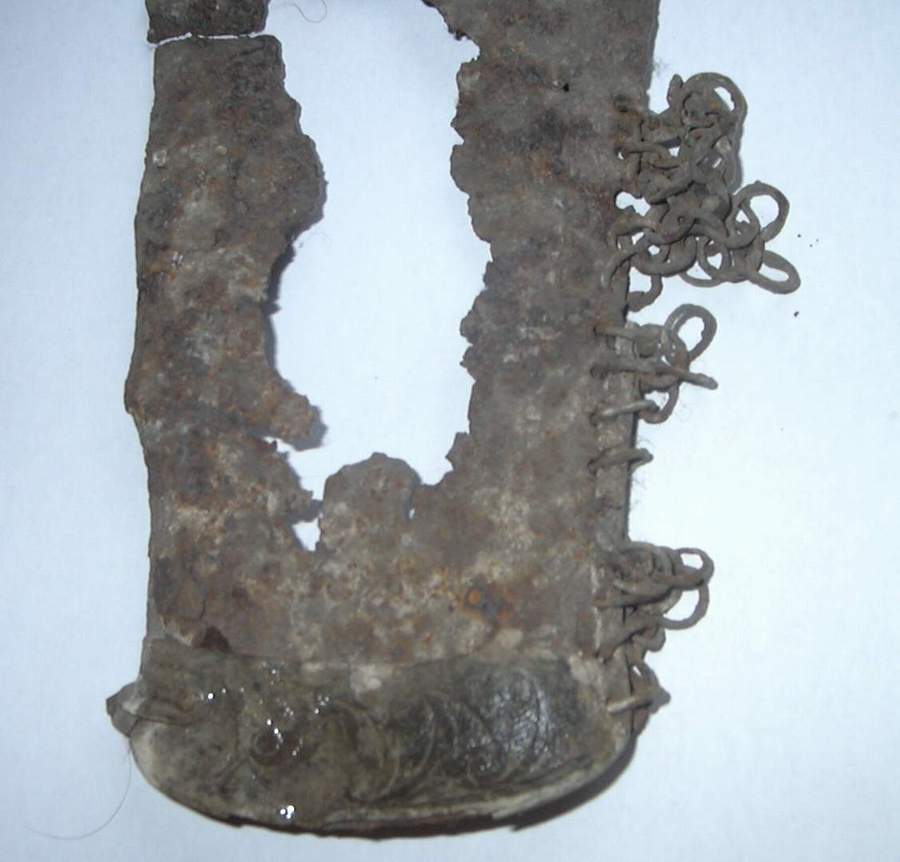 На противоположном конце доспешная пластина крепилась двумя кольцами к нижней пластине из того же самого металла, так что украшения из растительным орнаментом соединялись в единый узор.