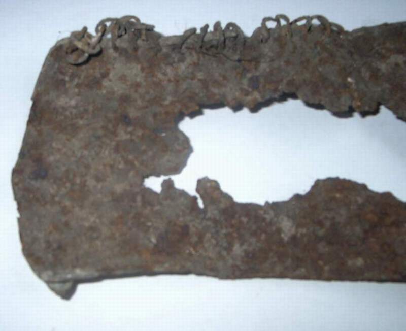 Один из самых ранних наручей, аналогичный по форме позднесредневековым образцам был найден в Сахновке, Украина (рис. 8). Он, как записано в отчете, был расположен на глубине 3,5 м, в доме сожженом монголами около 1240 года (1976 Кирпичников, 20). Это очень важное заявление, потому что наруч полностью аналогичен тем, которые использовались в XVI-XVII веках. Он состоит из двух выгнутых полукруглых пластин, соединенных между собой шарниром и застежкой, мы можем назначить его в вариант I.