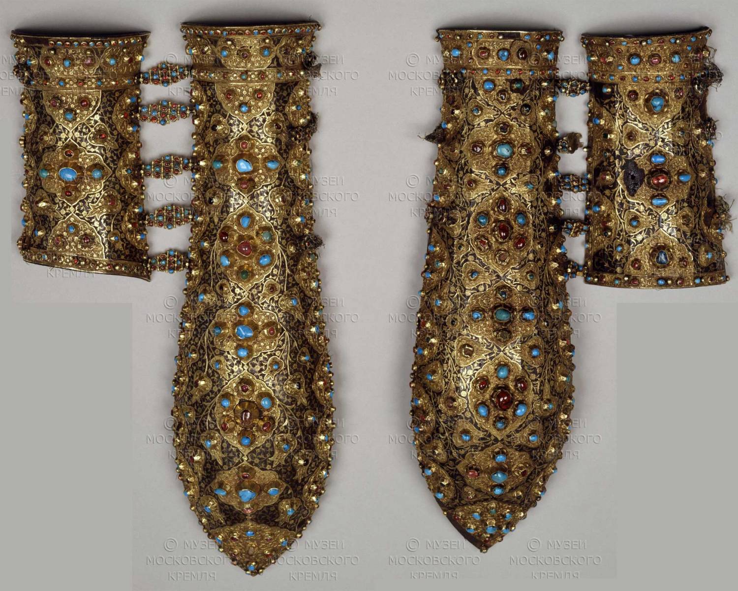 Часто, даже на боевых наручах сохранилась богатая отделка, состоящая из гравировки с золотом или серебром. Известны примеры наручей поверхность которых покрыта полудрагоценными камнями, золотом и гравировкой. Можно привести пример наруча султана Мустафы III, хранящегося в музее Топкапу Сарай в Стамбуле, и пары наручей князя Федора Милославского находящизся в Оружейной палате Москоского Кремля3 (1954 Гордеев, 79, 94, 95, 1988 AAP, 106) (рис. 7).