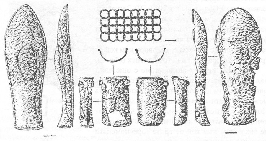На этот-же тот же период у нас есть еще наруч из украинских степей, который сохранился почти в виде фрагмента защиты от локтя до запястья (2002 Горелик, 79). Из-за отсутствия сохранившихся частей дополнительных элементов, также невозможно вывести, к какому из трех вариантов, упомянутых выше, принадлежал наруч (рис. 10).