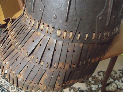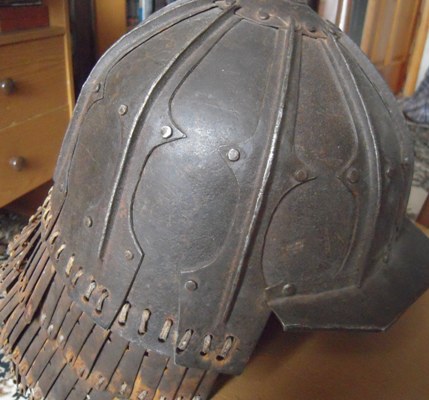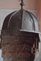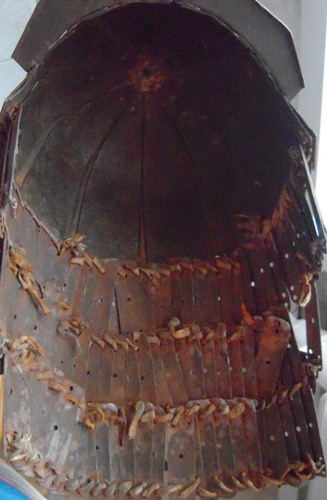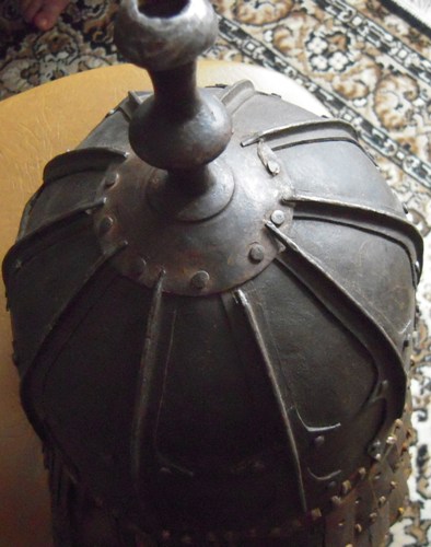 Данный шлем был куплен нашим поставщиком у одного из сотрудников китайских спецслужб. Которому шлем достался после закрытия одного из тибетских храмов. Шлем железный, увенчан бронзовой втулкой-навершием. Пластинки защищающие затылок, шею и уши соединены при помощи кожанных шнурков, некоторые из них от ветхости были заменены. Колокол этого шлема состоит из восьми сегметнтов, соединенных между собой продолговатыми фигрными полосами с тремя заклепками на каждой стороне. Также установлен весьма характерный для таких шлемов железный козырек.