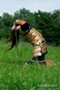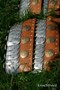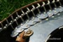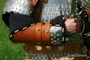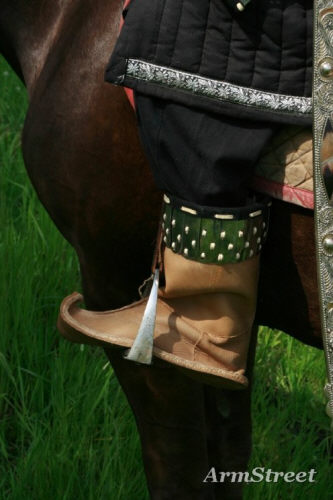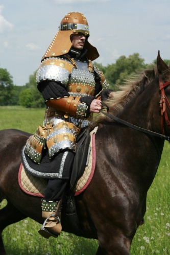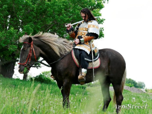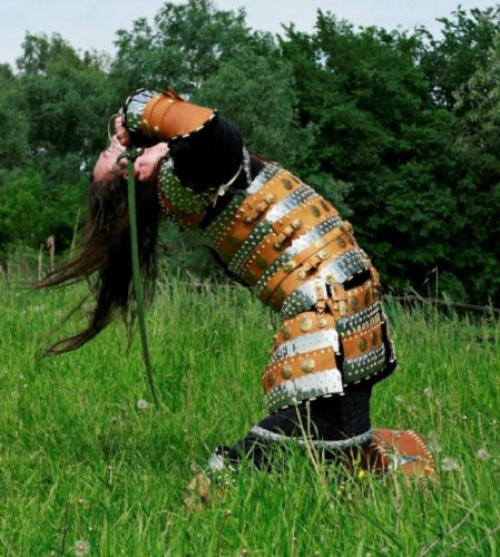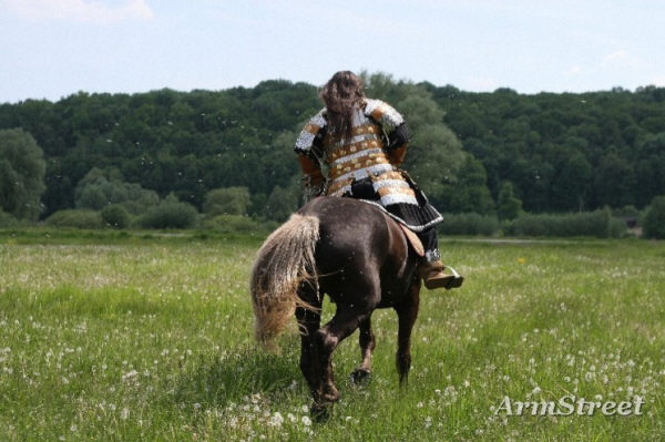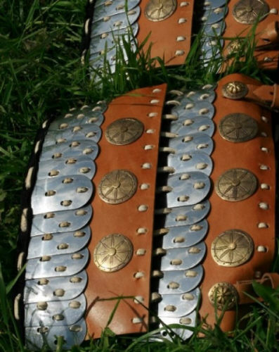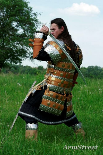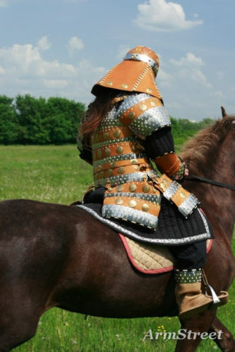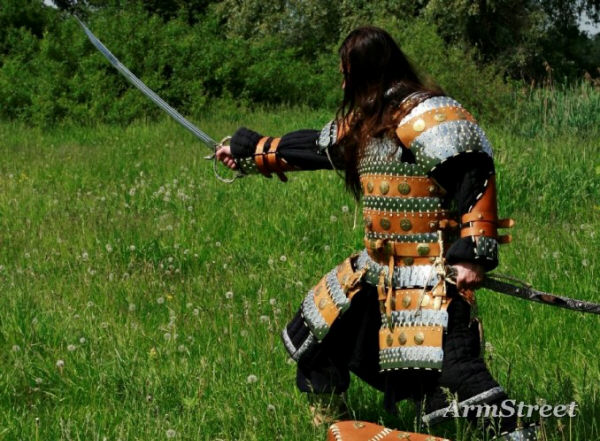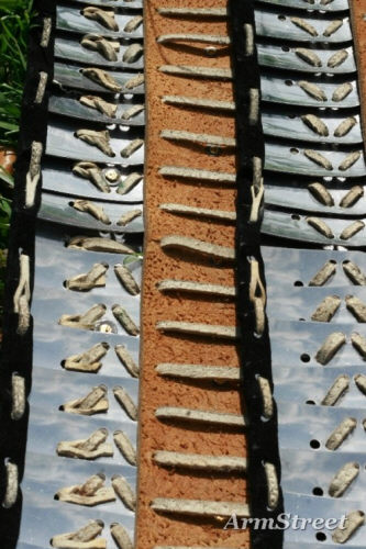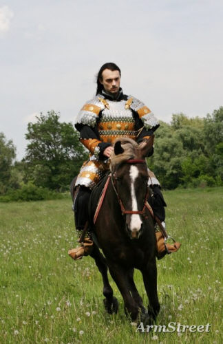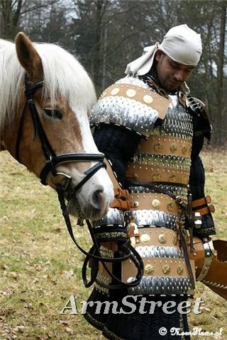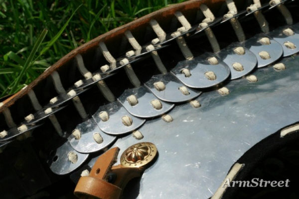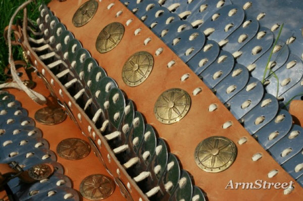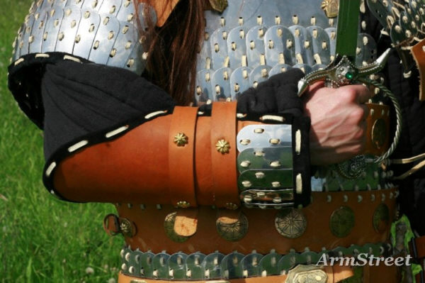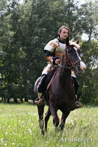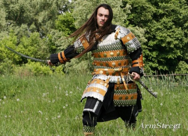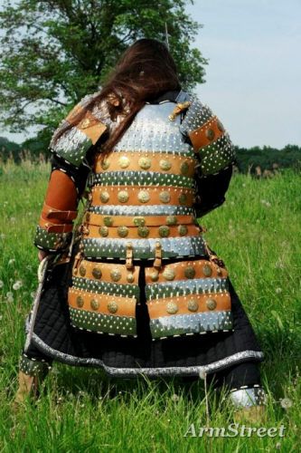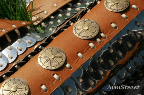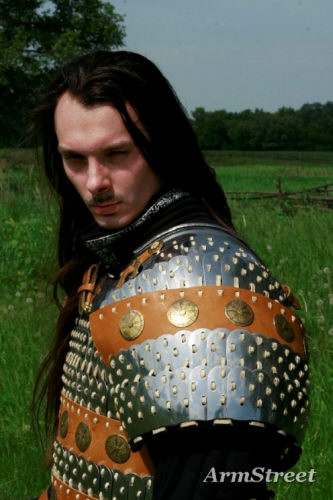 Мы очень рады представить вам этот пластинчатый доспех, потому что он нам самим очень нравится. Ламеллярными доспехами (от лат. lamella - пластина) назвают доспехи состоящие из большого количества пластинок лежащих нахлестом друг на друге и сплетенных между собой шнурками. Здесь ламеллярный доспех скомбинирован с широкими полосами толстой кожи для обеспечения минимального веса, лучшей подвижности и высоких защитных свойств. При изготовлении этого доспеха были приняты во внимание сохранившиеся образцы ламеллярных доспехов, данные археологии и изобразительные источники. Почти все подлинные технологии использовались для того сделать этот образец брони - работа со сталью и кожей, ручная ковка чеканка и литьё. Доспех украшен латунными бляхами эксклюзивной ручной работы, застежки также польностью аутентичные и эксклюзивнй работы. Доспех не тяжелый - около 25 кг. Это уже абсолютно готовый к бою доспех, который выглядит фантастически. Края деталей доспехов отделаны кожей. Шнуровка выполнена из сыромятной кожи. В комплект входит: ламеллярная кираса, оплечья, набедренники и наручи.