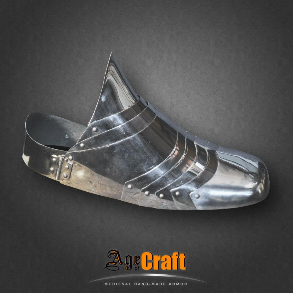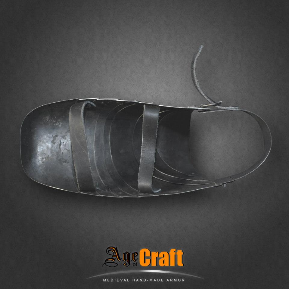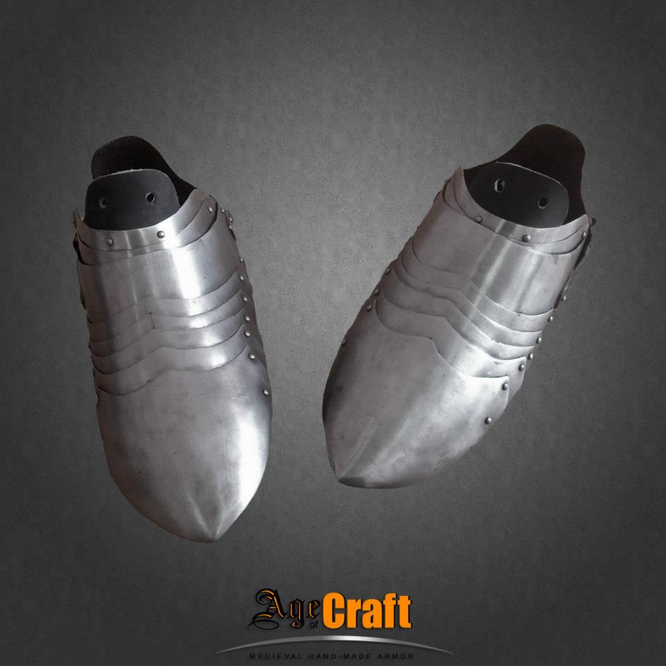 Пара саббатонов, то есть железных ботинок для защиты стопы от случайных и целенапрвленных ударов. Вместе с латной ногой дает полную рыцарскую броню для ног. Толщина металла 1 мм, в местах нахлеста, естественно получается 2 мм. Цена указана за пару и весит эта пара 700-900 грамм.