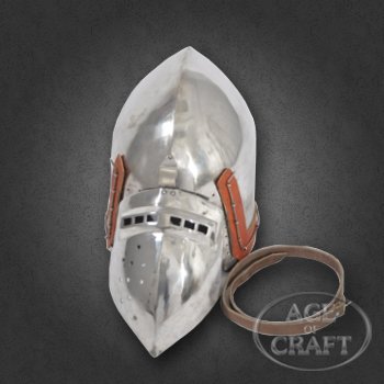 Данный шлем оснащен забралом типа клапвизор. Оно представляет собой выгнутую в перед пятиугольную пластину, нижний острый угол которой закрывает подбородок, а в центре есть небольшое ребро жесткости. С правой стороны забрала просверлены дыхательные отверстия (так делалось потому-что удар копья обычно приходится на левую сторону). Широкие глазные прорези сделаны на специально выбитом каннелюре и перекрыты поеречинам, таким образом глаза спрятаны глубоко, и защищены от ударов. Данный шлем имеет по умолчанию крепления, кожаную подкладку и шнурок под бармицу.