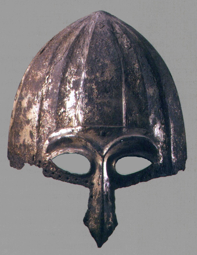 Шлем с. Никольское бывш. Орловской губ. Случайная находка, 1866 г. (Эрмитаж). Фото А. Н. Кирпичникова Тулья из трех частей выкована для увеличения прочности продольными желобками. К передней части прикреплена накладка с вырезами для глаз и горбатым заостренным наносником. Края накладки-полумаски и обрез наносника снабжены мелкими дырочками для бармицы, закрывавшей кроме шеи всю ниж нюю часть лица. По низу корпуса заметны остатки 8-9 петель для тыльной части бармицы. Обруч не сохранился. Весь шлем покрыт тонким серебряным позолоченным листом, который во многих местах поврежден и выкрошился. |
