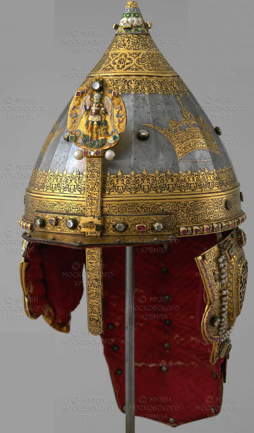 Шлем царевича Ивана Ивановича. Россия, 1557. Оружейная палата Московского Кремля. Золото, сталь булатная, ткань шелковая, камни драгоценные, жемчуг. Ковка, чеканка, насечка золотом, резьба, эмаль . Изготовлен по повелению Ивана Грозного для его трехлетнего сына Ивана в 1557 году. Об этом свидетельствует насеченная золотом надпись по венцу шлема. Стрельчатая форма шлема с высоким шпилем типична для первой половины XVI века. |