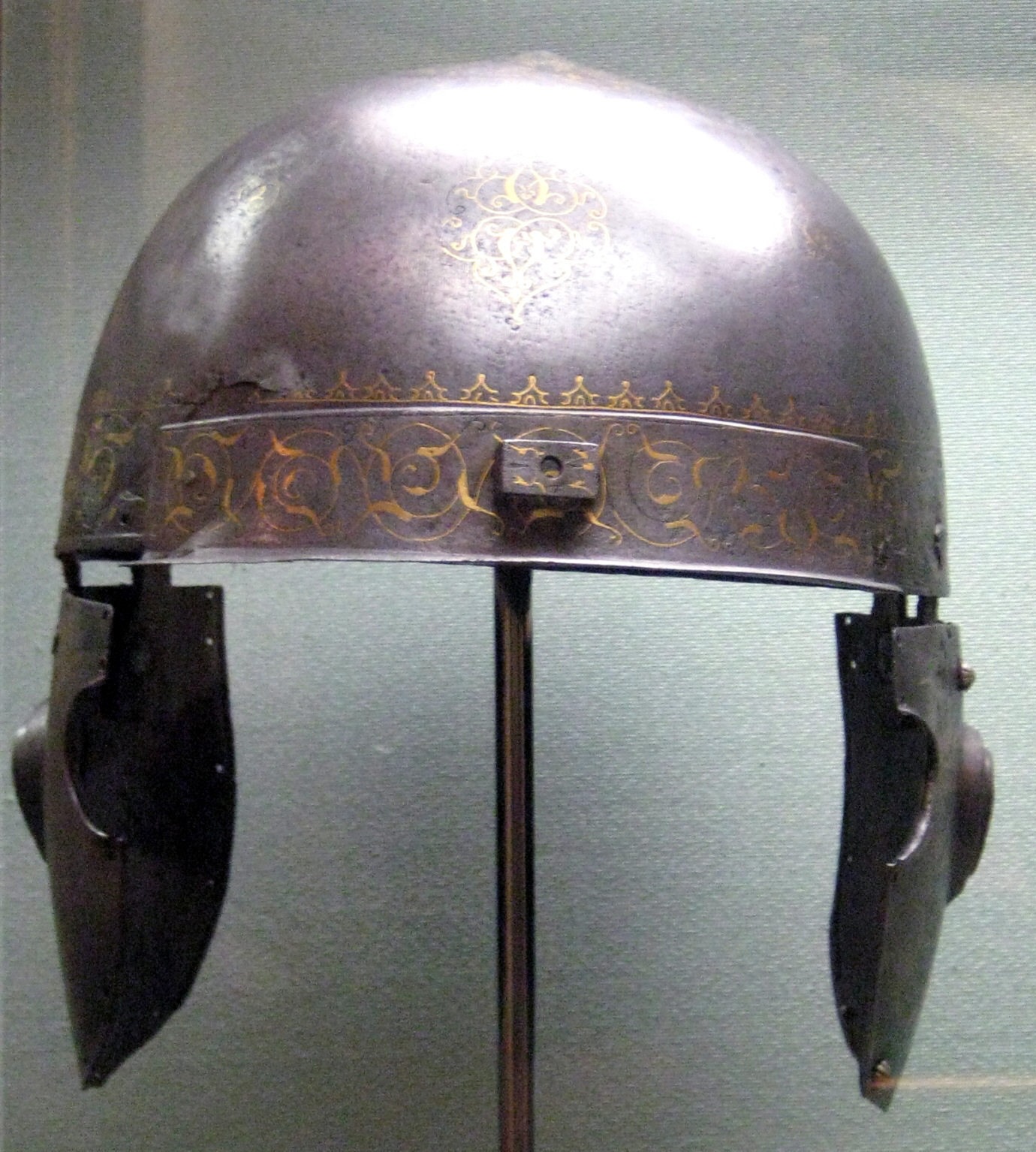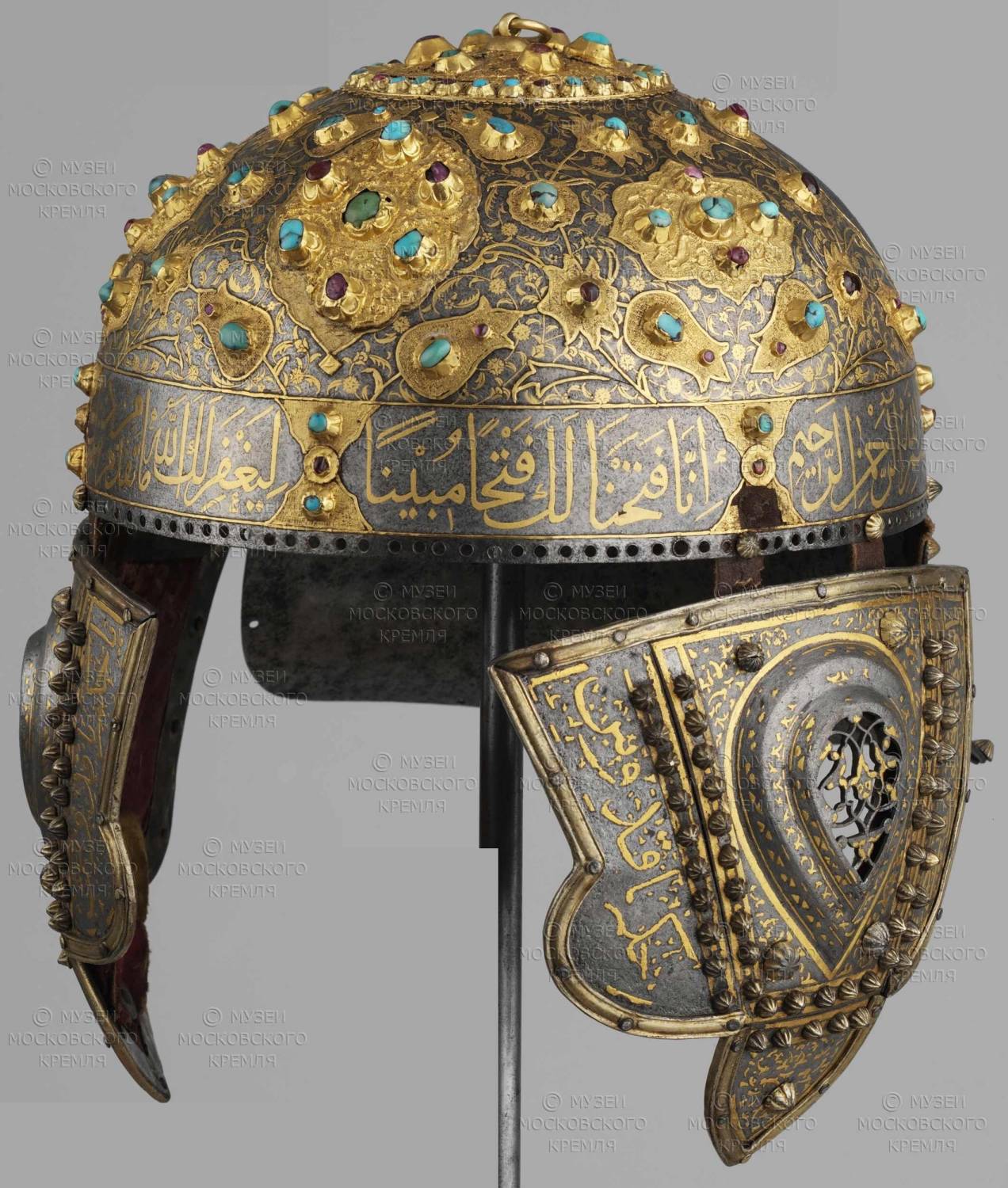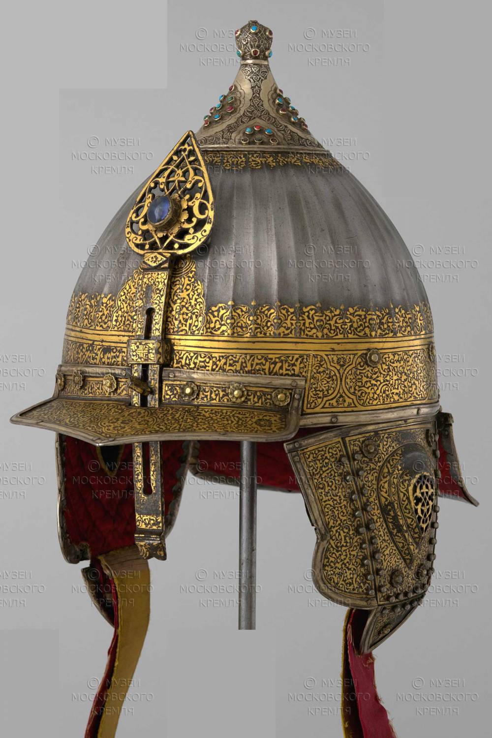 Шелом Ивана Грозного, предположительно 1547 год. Диаметр шлема 19 см – для головы подростка, Иван Васильевич вступил на царствование в 14 лет. Надпись у нижнего края тульи на арабском языке – "Аллах Мухамед" является сокращенной версией извесной мусульманской молитвы. На втором поясе написано: "Шеломъ князя Василиевичя великого князя с(ы)на Василиа Ивановичя господаря всея Руси самодержца". Хранится в музее Ливруст камера, Стокгольм, Швеция (Stockgolm Livrust Kammaren). |