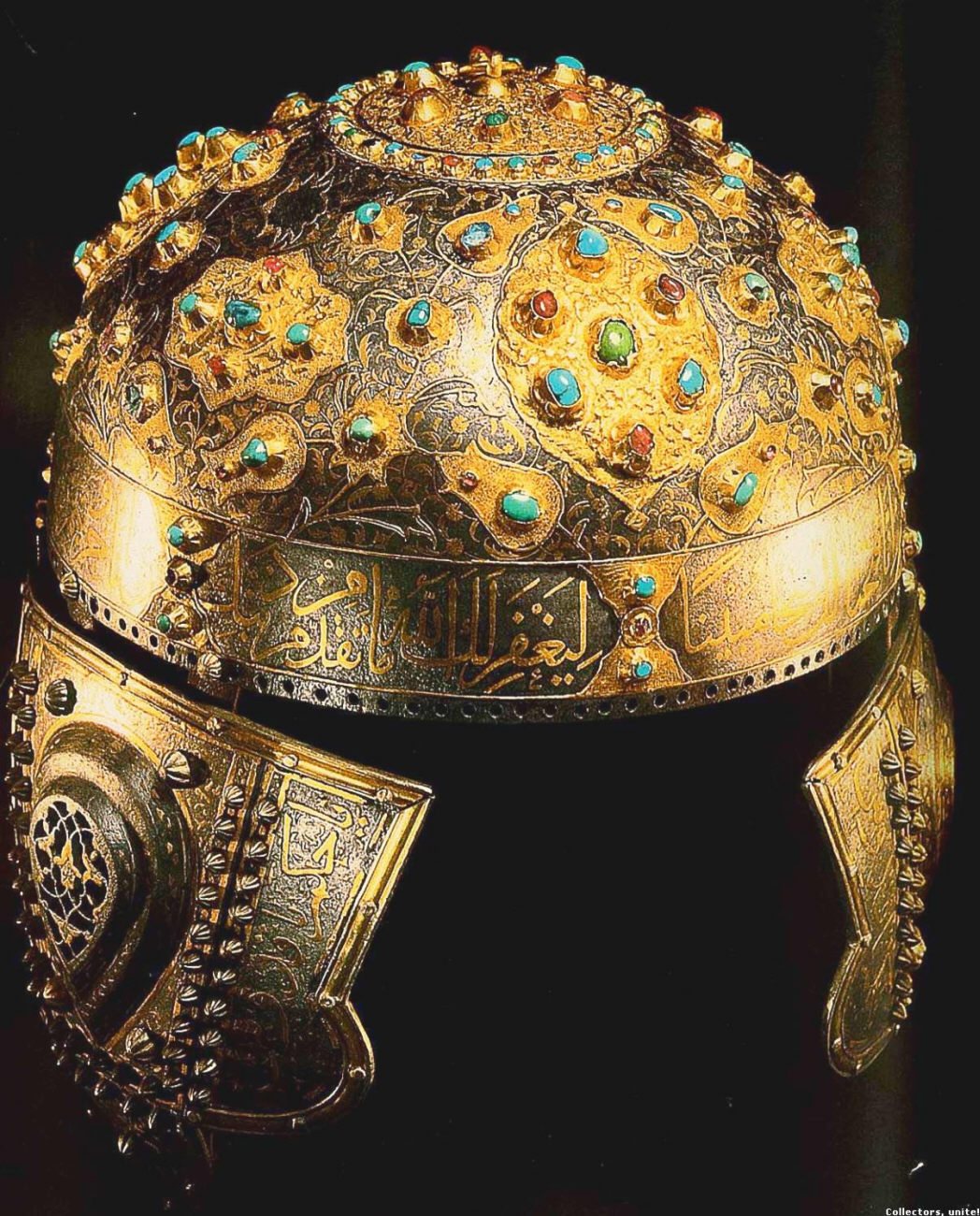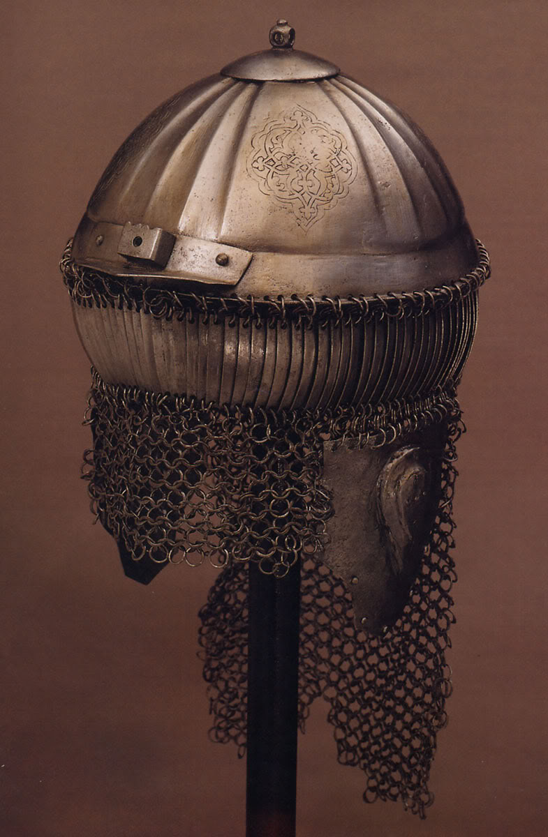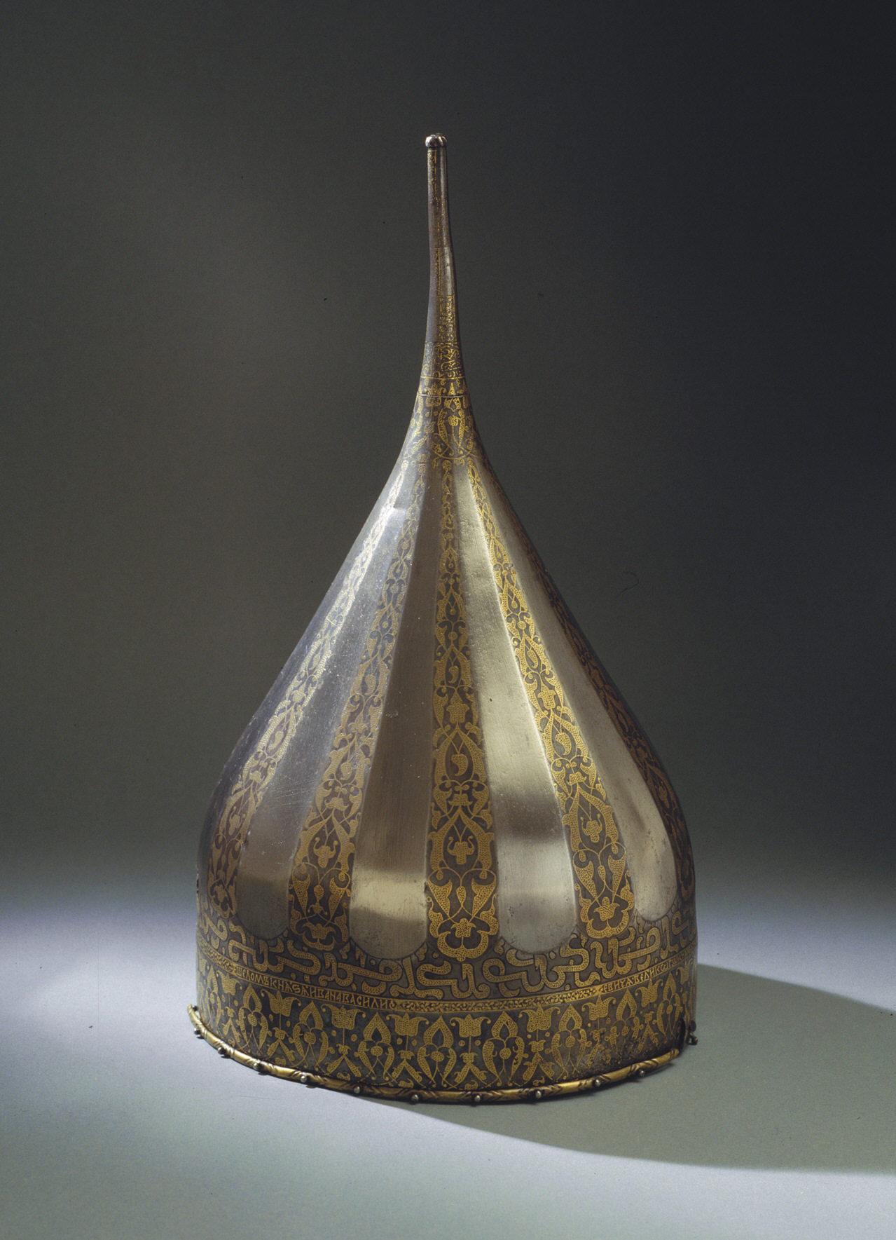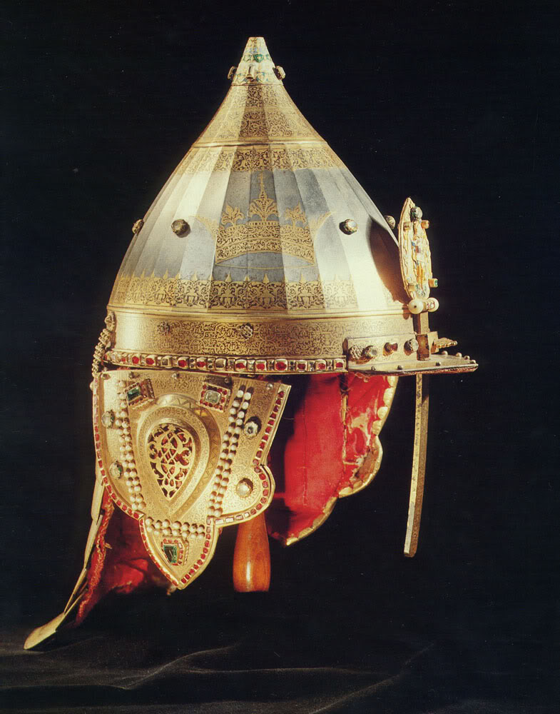 Шелом Ивана Грозного, предположительно 1547 год. Диаметр шлема 19 см – для головы подростка, Иван Васильевич вступил на царствование в 14 лет. Надпись у нижнего края тульи на арабском языке – "Аллах Мухамед" является сокращенной версией извесной мусульманской молитвы. На втором поясе написано: "Шеломъ князя Василиевичя великого князя с(ы)на Василиа Ивановичя господаря всея Руси самодержца". Хранится в музее Ливруст камера, Стокгольм, Швеция (Stockgolm Livrust Kammaren). |