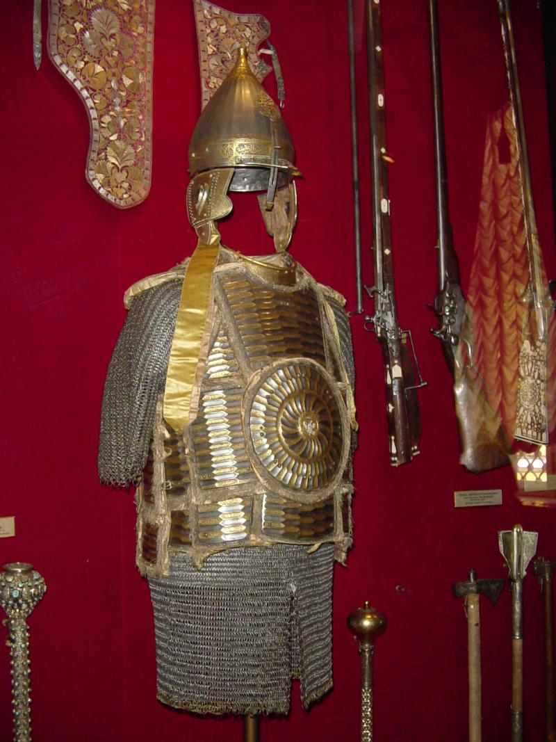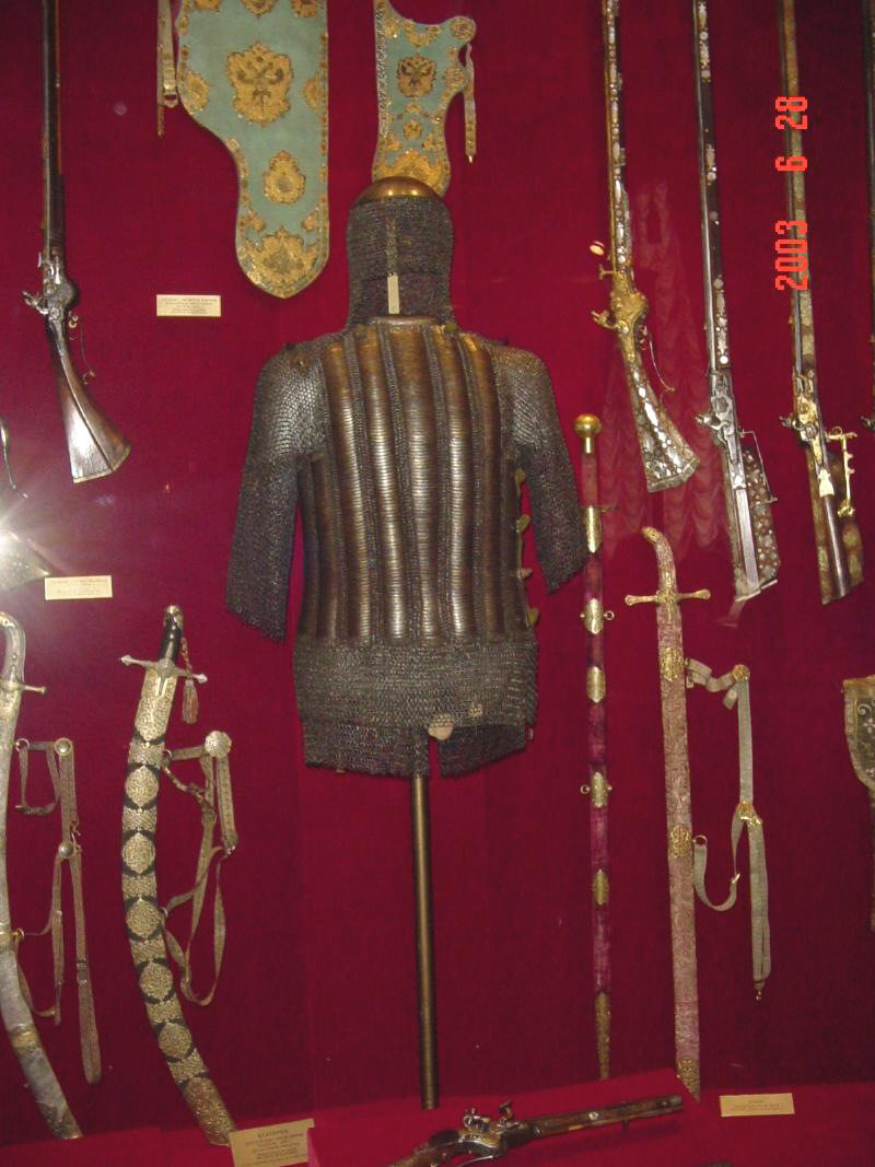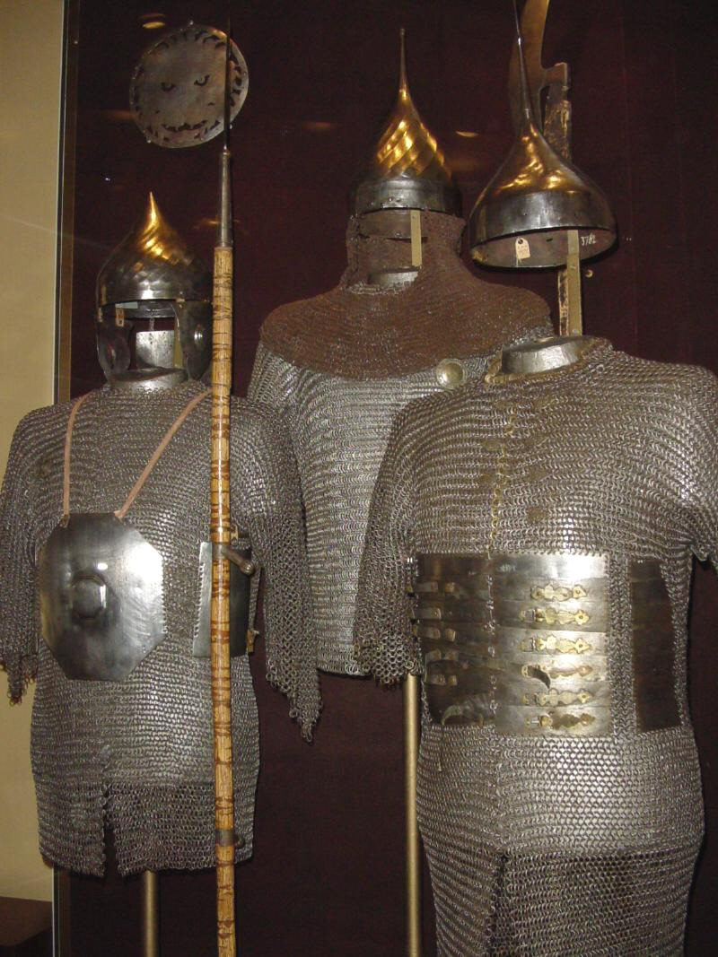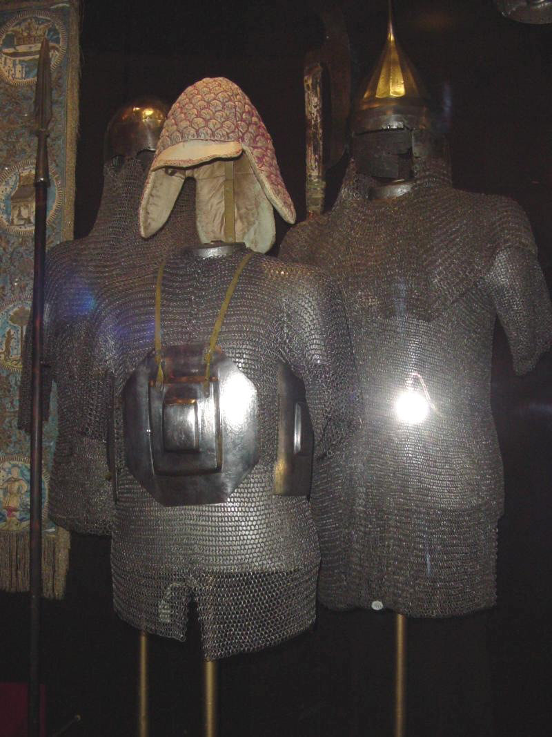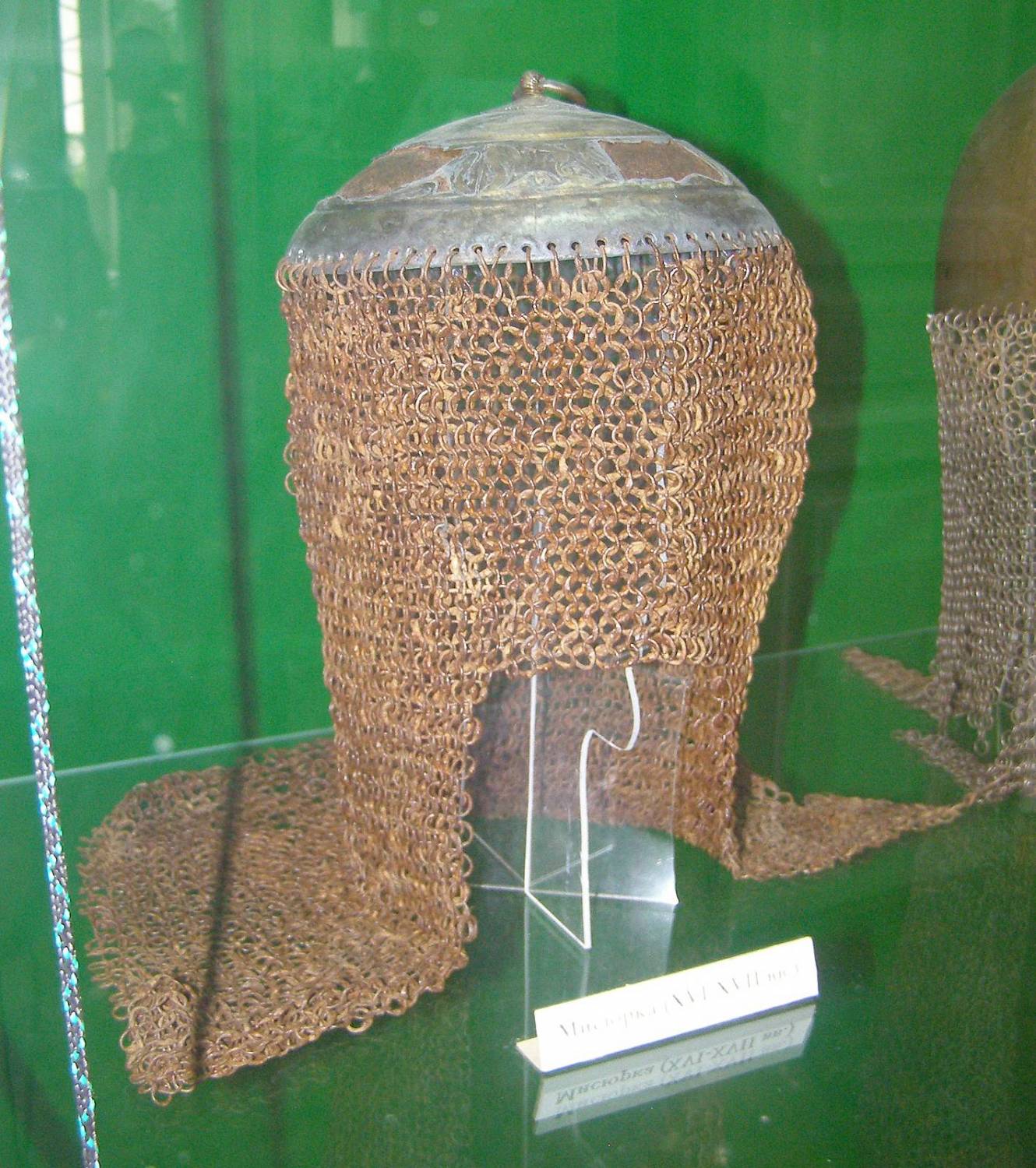 | Поврежденный юшман, шапка мисюрка. Главный исторический музей России - ГИМ, Москва. Фотографии седла, наручей, перначей и кистеня ниже. |