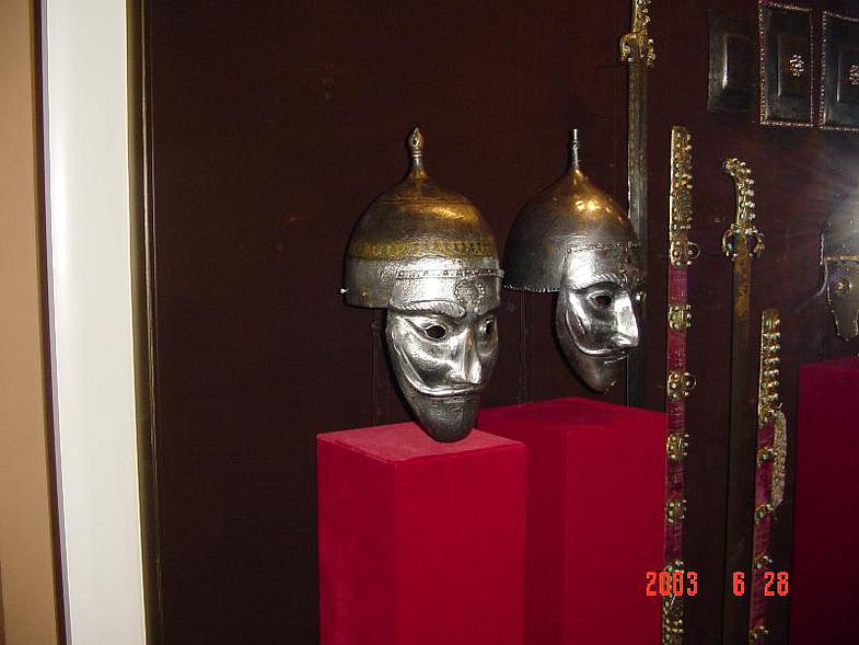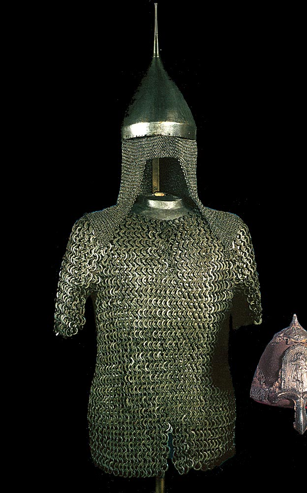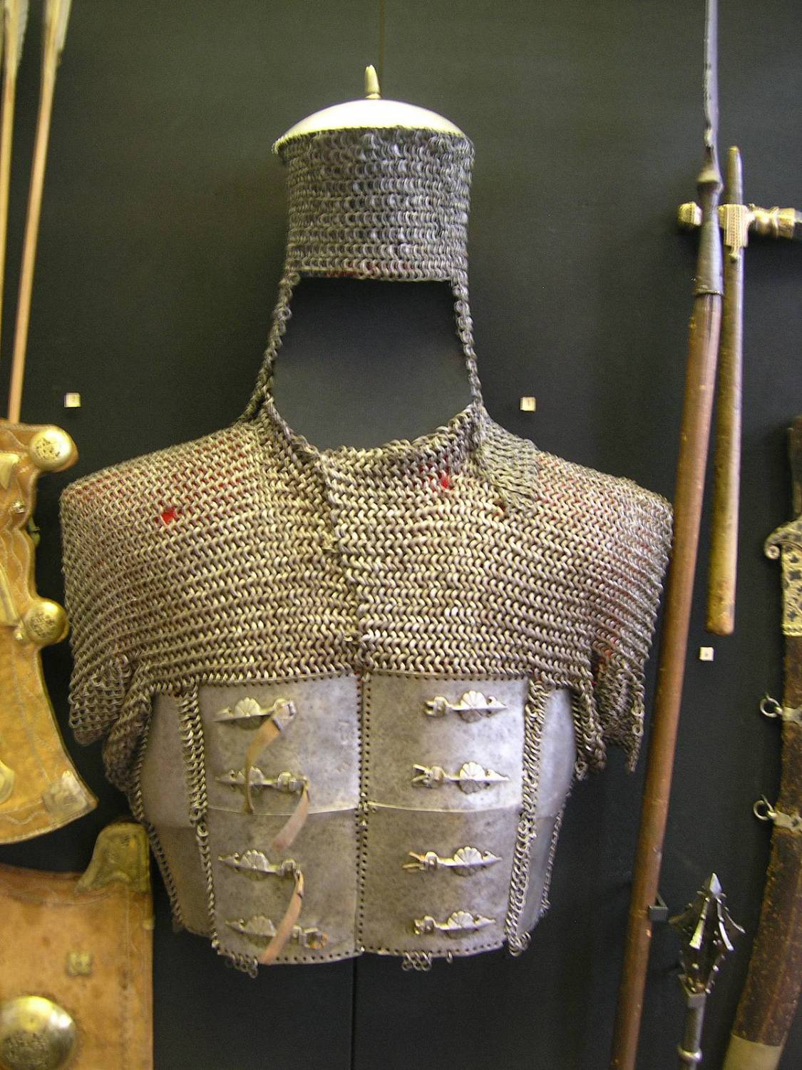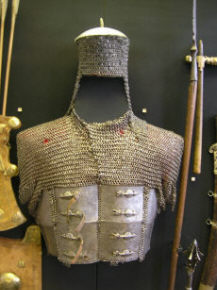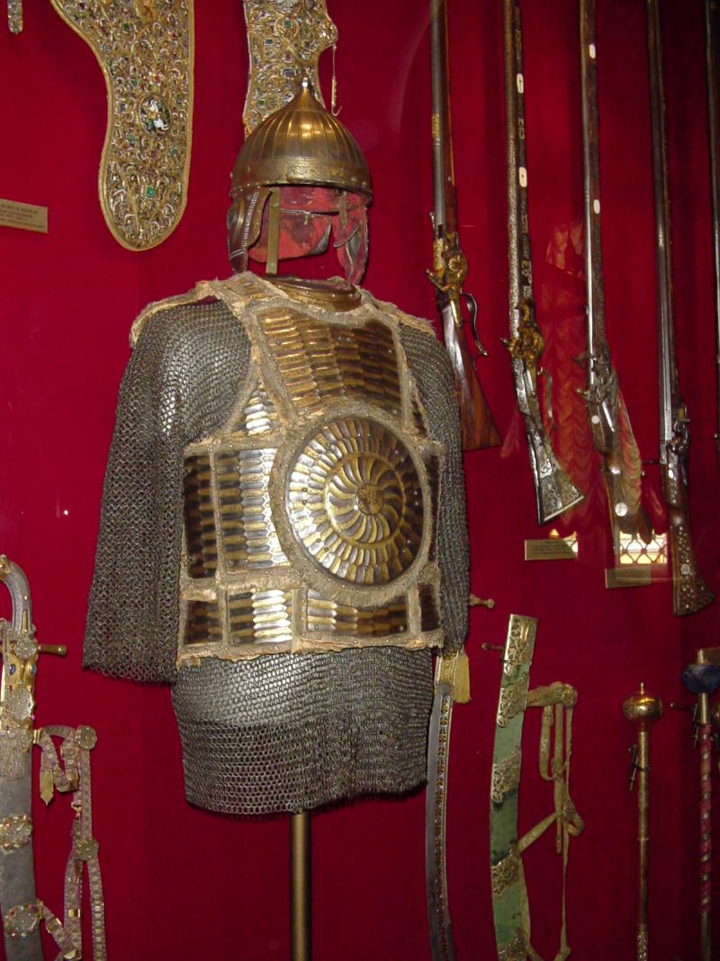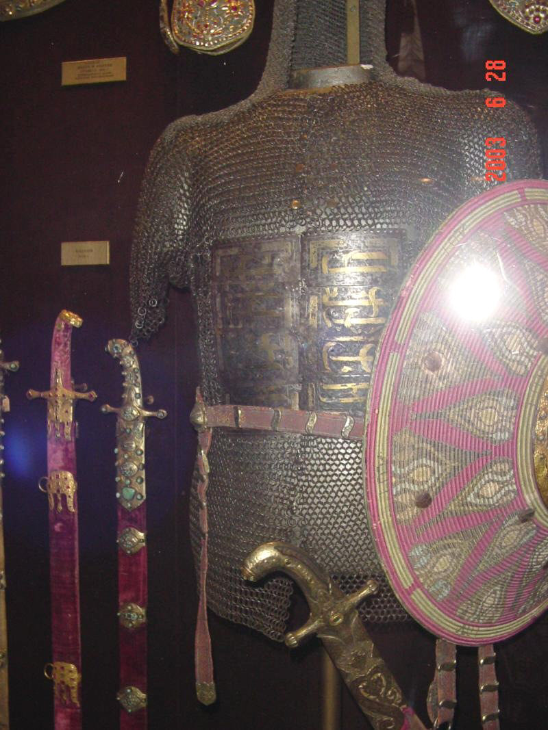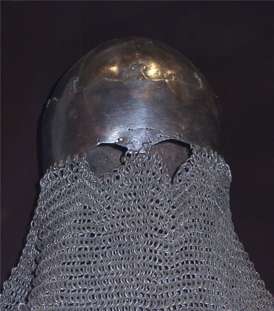| Поврежденный юшман, шапка мисюрка. Главный исторический музей России - ГИМ, Москва. Фотографии седла, наручей, перначей и кистеня ниже. |