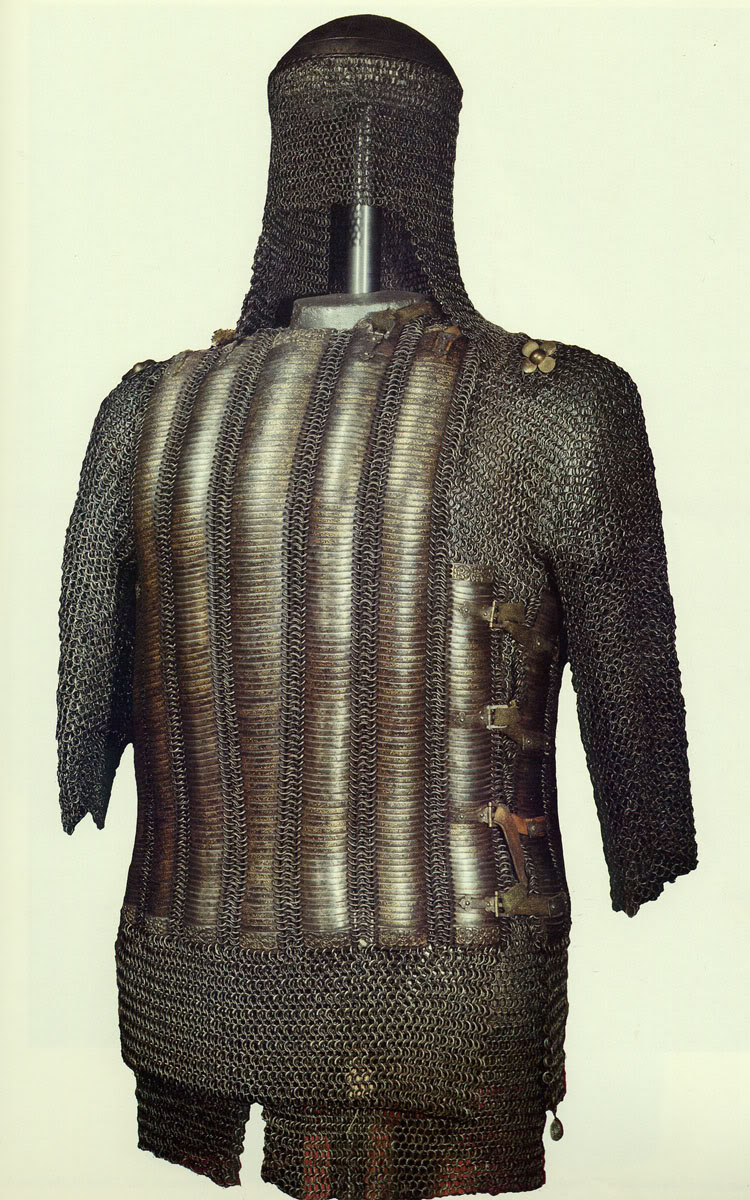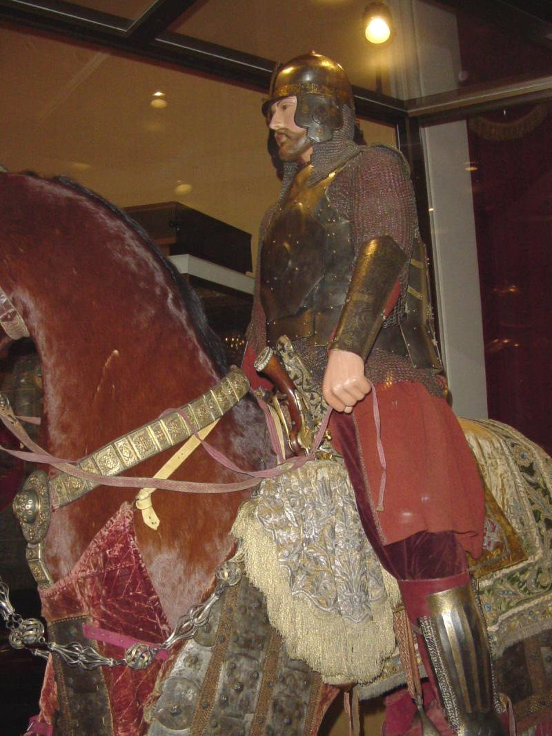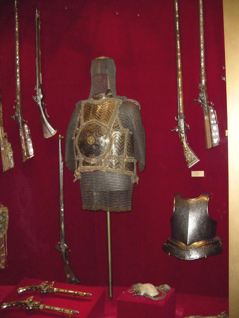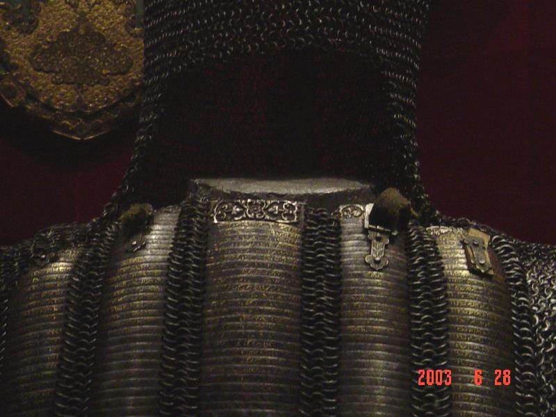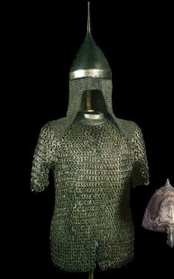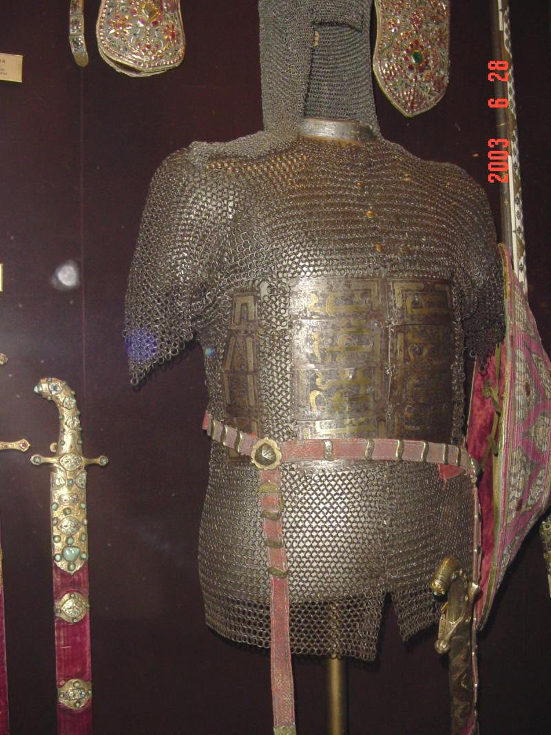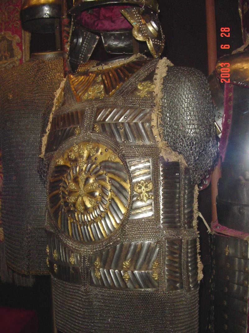 | Поврежденный юшман, шапка мисюрка. Главный исторический музей России - ГИМ, Москва. Фотографии седла, наручей, перначей и кистеня ниже. |