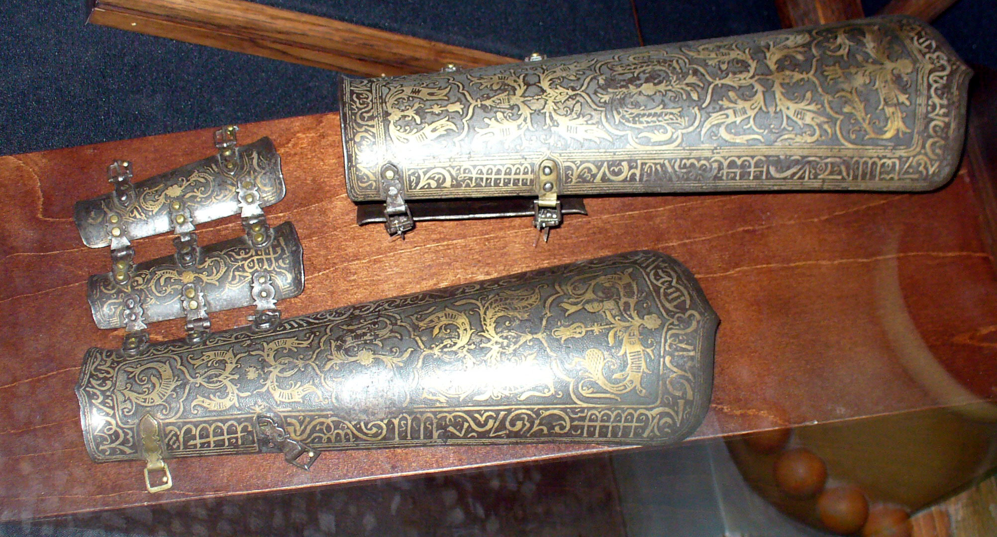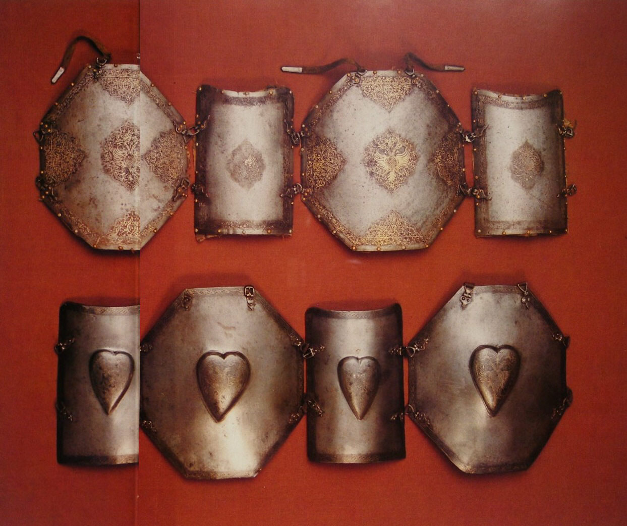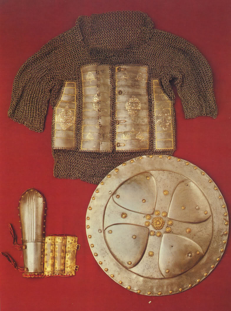 Юшман, наручи, щит боярина Никиты Романова, XVIIв. Государственная Оружейная палата Московского Кремля. Юшман состоит из крупных стальных пластинок, украшенных золотой насечкой и крупными надписями. Пластинки в количестве 105 штук соединены между собой кольчужными кольцами, клепанными на гвоздь. Этот юшман поступил в Оружейную палату после смерти боярина Никиты Ивановича Романова, в 1655 году. Длина юшмана - 62 см, ширина в подоле-50 см, вес юшмана - 11480г. Щит, 17-го век. Диаметром 52 см Из железа, круглый, с тисненым четыре плоских крестообразной формы листа. Вдоль границы литые медные заклепки с обычными шляпками. В центральной части гравированные шляпки заклепок. Наруч (налокотник) 17-го века, Длина 35 см. Наружная сторона гладкая, с вертикальными желобками в верхней части. Защита запястья из трех сочлененных пластин, прикрепленных к руке с бархатными ремешками и пряжками. Внутри покрыты тканью, крепление которой видно с внешней стороны – это гравированные медные заклепки. |