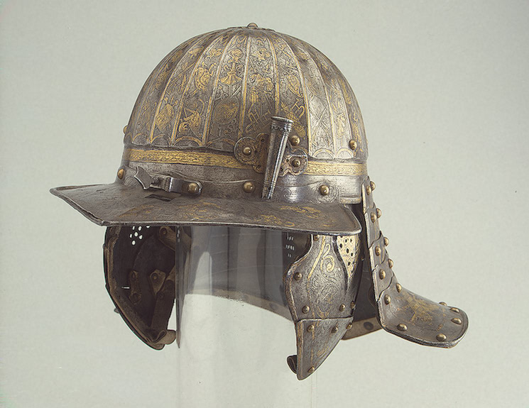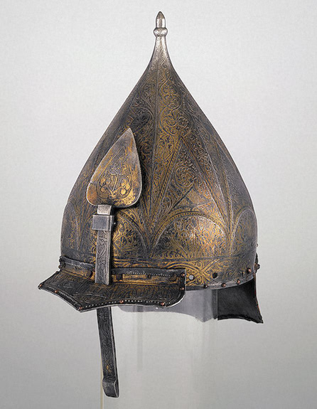 Каппелина шлем. Мастера: Ringler, Hieronymus. Германия, Аубург. Первая треть 17-го века Сталь и кожа, кованый, резьба, чеканка, гравированные и позолочены. Выста. 32,8 см. Доспехи турецкого стиля делали не только в Турции. |
