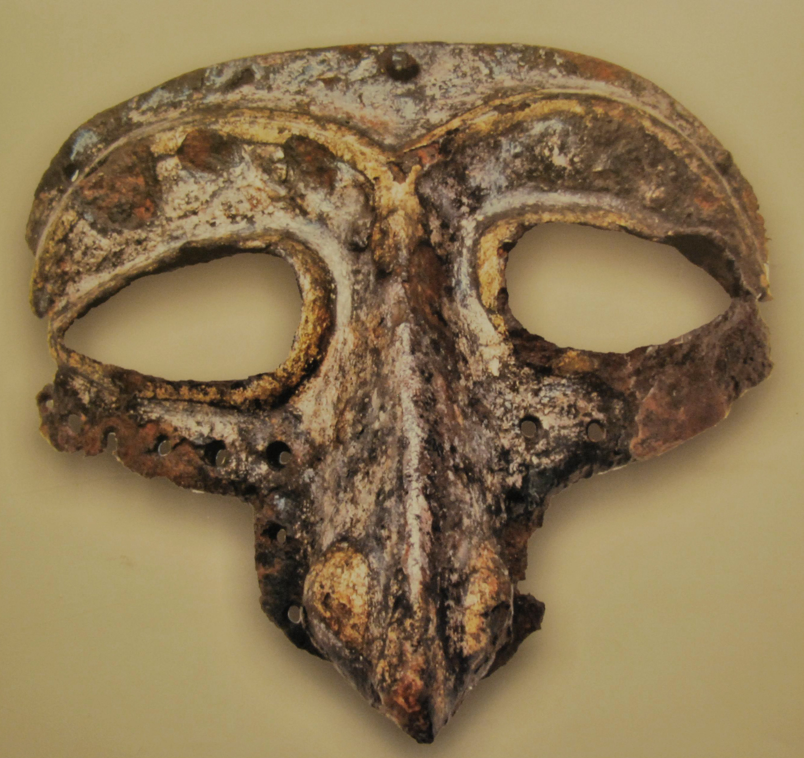 "Мугальские" то есть из Северной Индии шлемы с личинами. Оружейная Палата Московского Кремля. Эти маски имеют остатки налобных шарниров, и характерные монголоидные черты. Одна из личин жестко приклепана к шлему прямо сквозь шарнир – очевидно, это позднее «творчество» музейных работников. В действительности маски крепились к шлемам c помощью налобного шарнира и фиксирующего флажка, в закрытом положении проходящего сквозь специальную прорезь внутри защитного полукруглого буртика. И шлем и маска украшены схожим растительным орнаментом, что может свидетельствовать в пользу их комплектности. Еще один шлем из Оружейной Палаты Интересно, что у этого шлема нос, состоящий из двух частей, припаян к маске медным припоем, а на щеках сделаны характерные "шрамы", присутсвующие практически на всех поздних масках. |