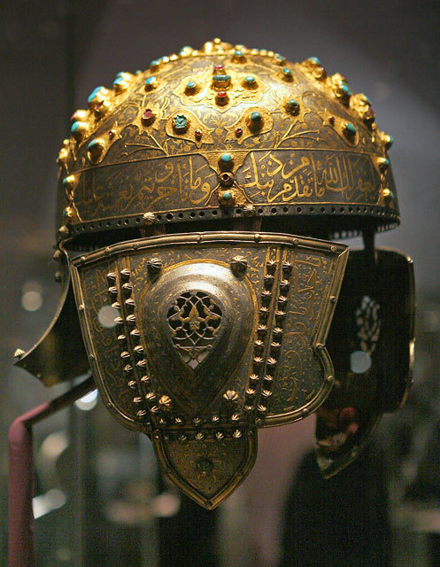 Шишак князя Федора Мстиславского. Оружейная палата Московского Кремля. Шлем турецкого происхождения, 16 век. Науши были добавлены реставраторами в 19 веке, они соответствуют шлему по периоду, но несколько ему велики. Надписи на арабском языке на тулье шлема: Во имя Бога благого и милосердного дал тебе победу явную, да отпустит бог тебе грехи, которые содеял ты и которые сотворишь исполнит тебя господь благодати своей, наставит на путь правды и укрепит помощью преславной. Надписи на наушах: Боже единосущный царь всяческих, бессмертный, премудрый, святый. |