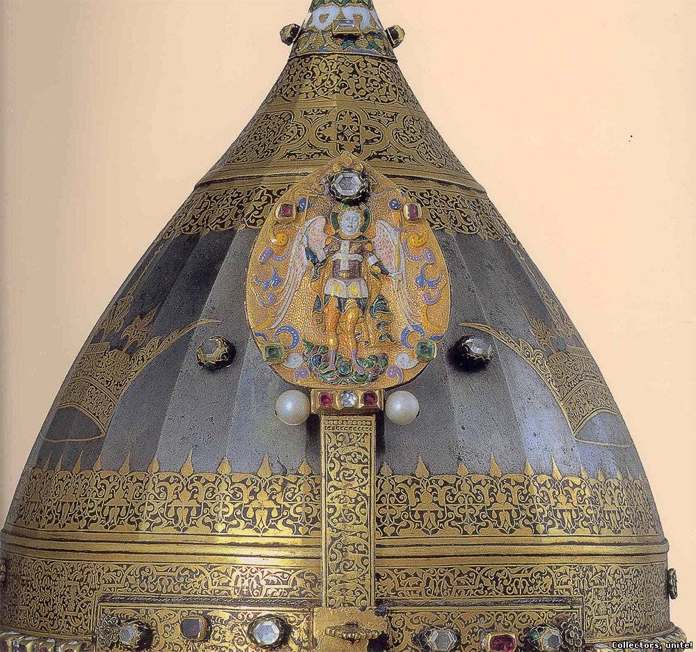 | Шлем Александра Невского, принадлежавший царю Михаилу Федоровичу. Втор. пол. 16 ст. В 1621 году переделанный мастером Никитой Давыдовым: он вероятно добавил фигурку святого на наносник и изображение короны на тулью. По ободу арабская надпись из Корана: «Обрадуй правоверных обещанием помощи от Аллаха и скорой победы» Оружейная палата Московского Кремля. Сталь, золото, драгоценные камни, жемчуг, шелковая ткань. Резьба, ковка, чеканка, насечка золотом, эмаль. Диаметр - 22 см. Высота - 35 см. Вес - 3285 г. |