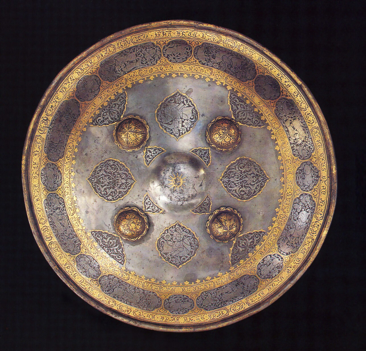 | Вызывает интерес щит. Он турецокго происхождения, середина XVII в. Тростник, сталь, золото, золотная нить, шелковая нить, рубины, бирюза, бархат; плетение, резьба, чеканка, насечка золотом, басма. Оружейная палата, Москва. | ||