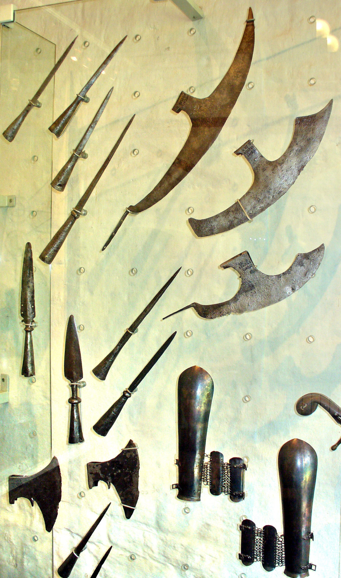 | Наконечники пик и копий, бердыши - из Соловецкого монастыря. Наручи, боевые топоры. Всё - XVII век, Россия. |