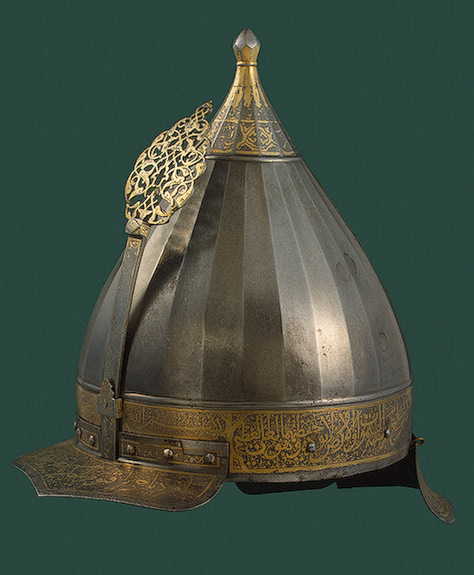 Турецкий шлем. Эрмитаж Санкт Петербург. Сер. - втор. пол. 16-го века Сталь и золото, ковка, клепка и насечка. Высота 27,9 см. |