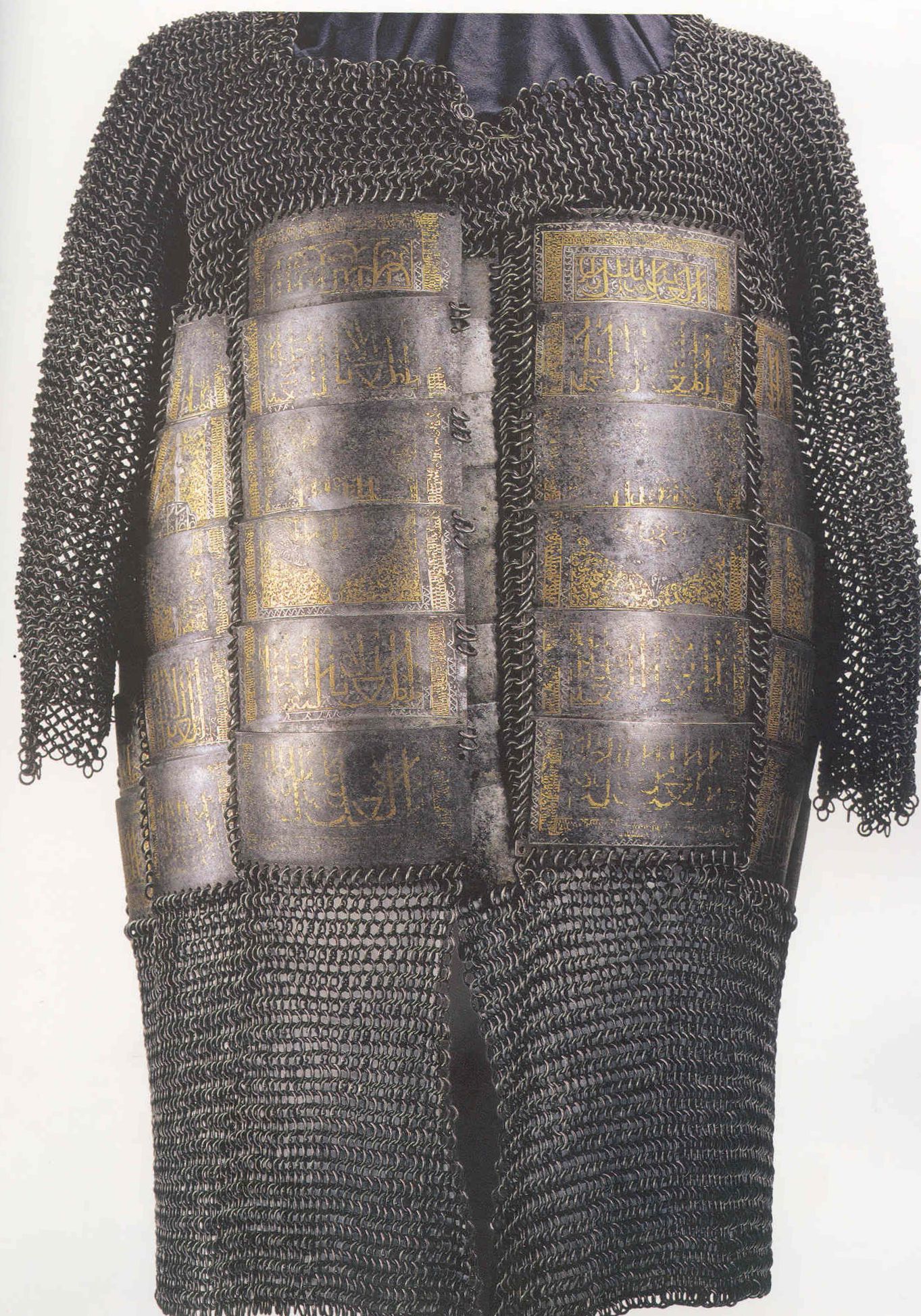 Юшман, Оружейная палата Московского Кремля. Он состоит из стальных гладких пластинок, соединенных между собой кольчужными кольцами. Всего пластинок в юшмане 99. Подол, ворот и рукава юшмана оторочены одним рядом медных колец. В кольца ворота был продет шнур зеленого цвета, но он не сохранился. На одной из пластинок, расположенных на груди, висит знак адрианопольского арсенала. Длина юшмана - 84 см, ширина - 53 см, вес - 12 300 г. В Переписной книге 1686/87 г. этот юшман записан под первым номером и оценен в 600 рублей. В 1654-1656 гг., во время войны с Польшей, а затем и Швецией, он входил в состав походной казны царя Алексея Михайловича. |