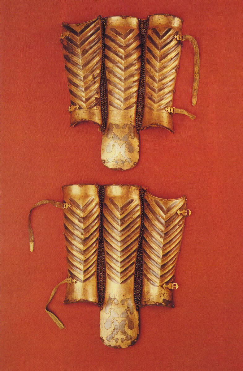Бехтерец мастера Конона Михайлова изготовленный для царя Михаила Федоровича в 1620 г. Грудь доспеха состоит из пяти рядов мелких пластинок по 102 в каждом ряду, спина из семи рядов таких же пластинок. Правый бок состоит из двух рядов, а левый бок, который застегивается, состоит из трех рядов пластинок с расчетом, что третий ряд будет закрываться при застегивании доспеха. Этот бехтерец поражает красотой и изяществом отделки; недаром в описи 1687 года он был оценен в 1000 рублей. В каждом боковом ряду имеется по 57 пластинок. Всего пластинок в доспехе 1509. Каждая пластинка выпукло-вогнутая, вычеканена специальным чеканом, следы которого ясно видны с внутренней стороны пластинки. К верхним пластинкам груди и спины прикреплены петли и ремни, при помощи которых доспех закрепляется на плечах. К пластинкам левого бока с той же целью прикреплены такие же петли и ремни. Пластинки доспеха с наружной стороны украшены золотом. Золотой навод, или насечка, выполнен необычайно тонко и с большим вкусом. Средние ряды пластинок на груди и на спине имеют сплошной навод золотом, смежные с ними ряды-только клейма, наведенные золотом. Золотой навод очень прост по своему рисунку и повторяется в одном и том же варианте по всему доспеху, Крайние пластинки рядов сверху и снизу украшены серебряными чеканными накладками. Пластинки доспеха по краям соединены кольчужными кольцами, между которыми вставлены кольца цельносеченные, но так как диаметр колец довольно значителен (12 мм) и между кольцами остаются большие просветы, Кононов вплетает в промежуточный ряд не одно, а два штампованных кольца. Подол бехтерца состоит из двадцати рядов колец, из них десять рядов цельноштампованных и девять рядов панцирных колец, крепленных на один шип, а к доспеху он прикреплен одним рядом кольчужных колец. Таким образом, в этом доспехе мы видим применение и кольчужной и панцирной техники крепления колец, причем нужно сказать, что и самых неудобных и уязвимых местах мастер применяет кольчужные кольца. В панцирной технике крепления колец мастер применяет сварной способ, то есть концы кольца при креплении на шип свариваются. По качеству и красоте отделки доспех представляет собой исключительное произведение. Каждая пластинка в ряду накладывается снизу вверх одна на другую, благодаря чему получается тронной слой пластинок, так как каждая пластинка остается открытой только на одну треть, остальные две трети закрыты последующими пластинками. Пластинки изготовлены из сталистого железа. Ширина почти всех пластинок одинаковая - 15 мм, толщина - 1 мм, длина различна в каждом ряду, судя по части доспеха: в плечах она длиннее, в талин - короче. Вcero колец в доспехе 9000, остальные примерно 11 000 необходимых для этого доспеха колец заменяются 1509 пластинками. Длина бахтерца - 66 см, ширина - 55 см. Вес 12 300 г. |