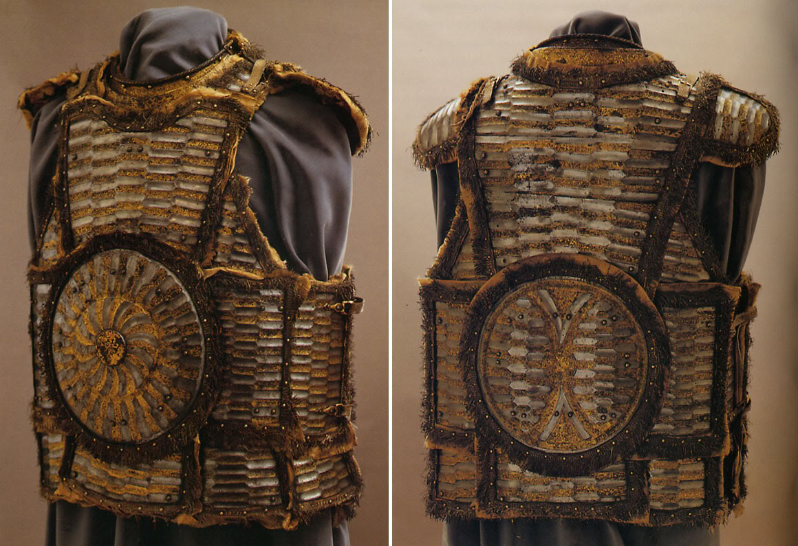 Зерцальный доспех (Зерцало) царя Алексея Михайловича. Стальные грудные и спинные пластины гофрированы и позолоченны и посеребрены шевронов. Центральную пластину украшает двуглавый орел в паутине. Орел увенчан короной, держыт в лапах скипетр и державу. Края украшены орнаментом и фигурками животных. Подкладка из красной простеганой на вате мягкой атласной ткани. |