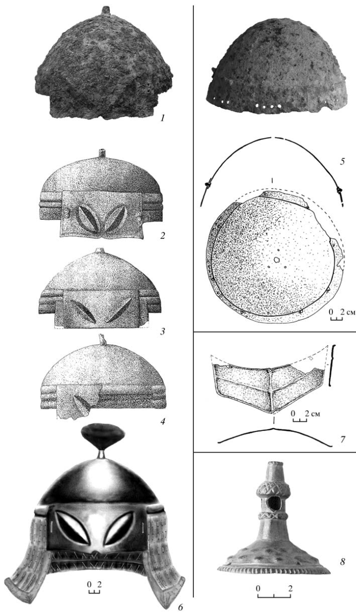 7 – козырек от шлема (железо); 8 – навершие шлема (бронза).