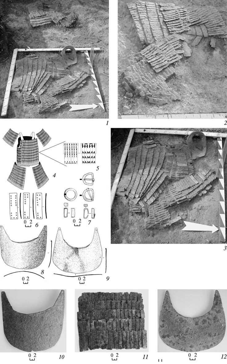 Рядом с пластиной лежали две пряжки, одна из которых имела наременный хомуток, и здесь же находился третий слой панцирных пластин, который состоял из двух небольших фрагментов, лежащих недалеко друг от друга. Оба фрагмента были повернуты на изнаночную сторону. В каждом находилось по пять рядов из 17 пластин. Ряды расходились в разные стороны (по восемь в каждую) от центральной пластины.