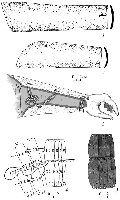 Малая пластина защищала внутреннюю часть руки. Ее размеры: левая сторона – 16 см, правая – 21 см, ширина нижней части  5 см, верхняя сторона срезана овалом, длина хорды – 8.5 см. Нижняя часть овального среза должна была уходить в локтевой изгиб и при таком срезе не ранить его. По левой стороне пластины пробиты две группы парных отверстий, расстояние между которыми – 11 см. По правой стороне прослежено три группы парных отверстий, расстояние между которыми аналогично правой стороне большой пластины. Малая пластина также имела небольшой изгиб по вертикальной оси и обвальцованный нижний край. Пластины связывались между собой, давая возможность регулировать плотность крепления (рис. 5, 3). Верхняя пара отверстий большой пластины, скорее всего, соединялась с плечевой защитой.