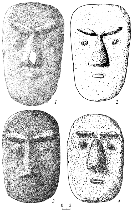 Для защиты лица чжурчжэни применяли железные маски. В настоящий момент их обнаружено четыре (рис. 2). Все они однотипны. Исключение составляет лишь небольшая разница в размерах, что, скорее всего, объясняется индивидуальным изготовлением. Первая маска была обнаружена при раскопках центральных ворот Шайгинского городища (Шавкунов, 1982). Она была опубликована В.Э. Шавкуновым, который дает полное ее описание, почему-то относя ее к стилизованному изображению лица монголоидного типа (1993. С. 80-83). Вторая маска была обнаружена на Ананьевском городище в обвалованном участке в западном районе памятника (Гладченков и др., 2006). Известна маска, найденная браконьерами на Плахотнюкинском городище. Еще одна маска “открыта” нами на браконьерском сайте. Место ее находки не известно, но нет сомнения, что она также происходит из чжурчжэньских памятников Приморья.