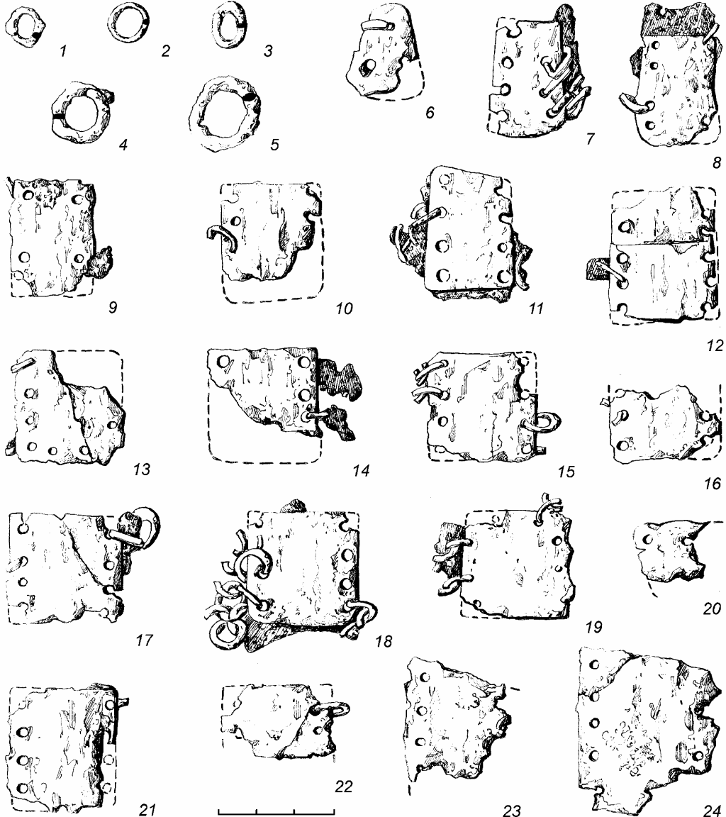 Помимо части доспеха, на памятнике найдены еще пять колец кольчужного плетения (изобр. 1-5), их диаметр колеблется от 9 до 19 мм при диаметре сечения круглопроволочных колец 1,5-2 мм и размерах овальных сечений 3х1-2 мм. У трех колец видны следы клепки. Как известно, кольчуга, появившись еще в сарматское время, «доживет» до XVII в6. Появление же плоских колец, чаще клепаных, А.Н. Кирпичников относит ко времени после 1200 г7.