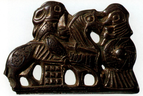 | Мужчина на коне встречает женщину с щитом и питьевым рогом. Брошь, Тиссо, Зеландия. Находка Флеминга Нильсона./td> |
