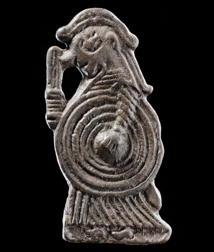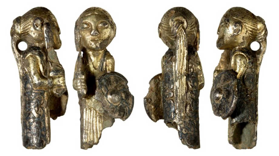 У нас было очень мало изображений вооруженных женщин того периода. Обычно ученые применяли термин "Валькирия" относительно периода позднего железного века как правило безоружным женщинам, которые предлагают чашу или рога меда, иногда в одиночестве, иногда в компании с вооруженным мужчиной, который часто верхом на лошади. То есть мотив этих сцен приветствия, дает основания связывать его мифом о том, что ждет настоящего викинга в загробной жизни. Но есть изображения и вооруженных женщин: вышивка на гобеленах 834 г. н. э. с захоронения в корабле Осеберг, и небольшой рельеф на броши (фото ниже). Благодаря датских любителям поисковика с металлоскателем, сообщество которых неуклонно растет, мы имеем теперь объёмную детальную статуэтку Валькирии!