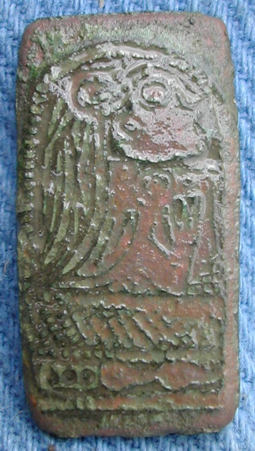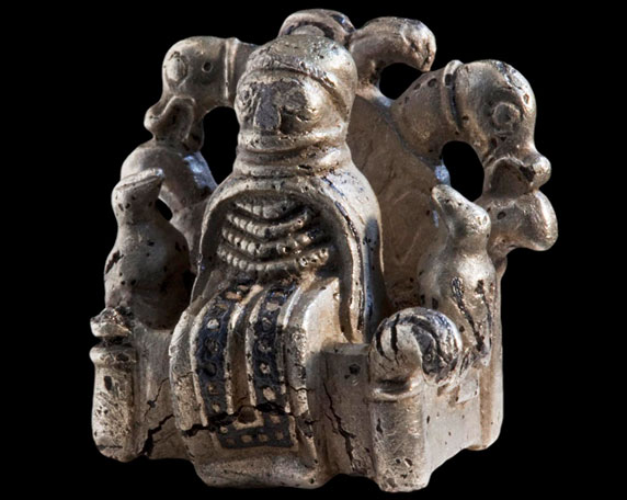 | Шахматная фигура: Один на троне. Железная покрыта серебром с остатками золочения и черни. Вес: 9 грамм Высота: 17,5 мм Ширина: 19,8 мм Глубина: 12,4 мм. Находка Тома Кристенсена в районе Лайре на Датской Зеландии, датирована нач. 10 века. Фото из другого ракурса |