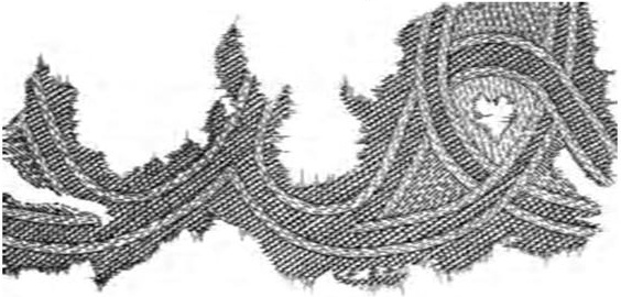 Среди упомянутых находок из Чернигова и его округи золотное шитье из Черной могилы отличается особой роскошью. В археологических фондах Государственног о исторического музея сохранилось несколько кусков этой ткани с золотой вышивкой общей длиной около 55 см и шириной от 7 до 12 см. Вышивка была сделана по одноцветной шелковой ткани саржевого переплетения с одним утком и одной основой. Расти тельный рисунок на ткани обведен четким контуром, который выполнен шелковыми нитями стебельчатым швом. Пространсгво между контурными линиями заполнено золотными нитями, шитьем “на проем”21. Золотые нити изготовлены из шелковой основы, на которую навили тонкую золотую фольгу. Судя по внешнему виду, шелковая основа золо тых нитей изготавливалась из пряденого шелка; нити самой ткани из не крученого, не пряденого шелка. На некоторых фрагментах ткани заметно, что между линиями узора золотого ши тья сохранилась вышивка из шелковых нитей, выкрашенных в темный, вероятно, синий цвет (Рис. 1). Шелковая ткань из Черной могилы представляла собою, как минимум, трехцветное полотнище, вышитое золотными и шелковыми нитями. От орнамента сохранились фрагменты кринов и стилизованные растительные побеги. Вероятно, именно отсутствие в орнаменте фигур людей и животных натолкнули М.В. Фехнер на мысль об иранском происхождении шелка. Однако, этот вопрос не может считаться решенным без дополнительных исследований. Например, орнаменты в виде кринов часто использовались мастерами Византии и Древней Руси.