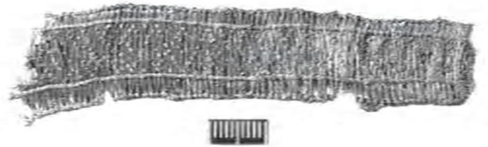 Во время раскопок курганов могильника Шестовицы остатки золотных нитей от лент и позументов были зафиксированы в пяти наиболее “богатых” захоронениях по обряду трупоположения: в курганах №№ 36, 38.6, 78,110 и в исследованном под руководством В.П. Коваленко и А.П. Моци в 2006 г. кургане № 28. Например, в погребении 6 из кургана № 38 среди костей скелета обнаружили переплетение из тоненьких серебряных проволочек. Наиболее вероятно, что проволока осталась от накладных позументов, которыми украшали лицевую часть головных платков или других головных уборов.9 Остатки подобных украшений хорошо известны среди находок в шведском могильнике Бирка10. В женском захоронении из кургана № 78 рядом с костяком нашли фрагмент ленты. Лента была сплетена на специальных табличках. Ее основа состояла из круглой в сечении серебряной проволоки, толщиной 0,3 0,5 см, и шелковых нитей. Шелк образовывал геометрический орнамент в виде ромбов11. Из могилы происходят четыре фрагмента ленты общей длиной около 22,3 см и шириной 1,6 1,7 см (Рис. 2). Подобными лентами в эпоху викингов окаймляли края парадной верхней одежды. Многочисленные аналогии такой каймы известны в Бирке, Гнёздово, курганах Маммен и Хёнинкирха в Дании12. Наиболее близкими аналогиями ленте из кургана № 78 можно считать находки из погребений Бирки № 824 и № 97713. Осталось неизвестным точное местонахождение этой ленты, но, судя по другим подобным находкам, она могла украшать края плаща, фартука или верхней туники. Остатки “золотых” нитей от вышивки на мешочке или “Таманце” упомянуты в комплексе находок из кургана № 36. Так как ни сами нити, ни их изображение не сохранились до нашего времени, трудно судить о том, к какой части костюма они могли принадлежать.