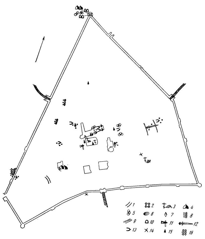 Находки предметов воинского снаряжения и оружия в хорошо стратифицированных горизонтах культурного слоя Московского Кремля можно связывать с исторически известными военными эпизодами. Так, археологические свидетельства неопровержимо подтверждают версию письменных источников, о разгроме Москвы монголо-татарами и пожаре в декабре 1237 г. либо январе 1238 г. Часть коллекции обнаружена в слоях угля и золы, на подступах к крепости у ее проездных ворот, на полях войны. Это меч, затонувший во рву в восточной части оборонительного рубежа крепости; это боевые наконечники стрел, обрывки кольчуг, оставленные на поле сражения, в центральной части городища. Именно здесь, где размещалось исторически сложившееся ядро московского поселения, локализуется значительная часть коллекции «воинских вещей». Находки меча и боевых наголовий в заполнении рвов крепости позволяют уточнить топографию ее фортификационных сооружений (рис. 6).