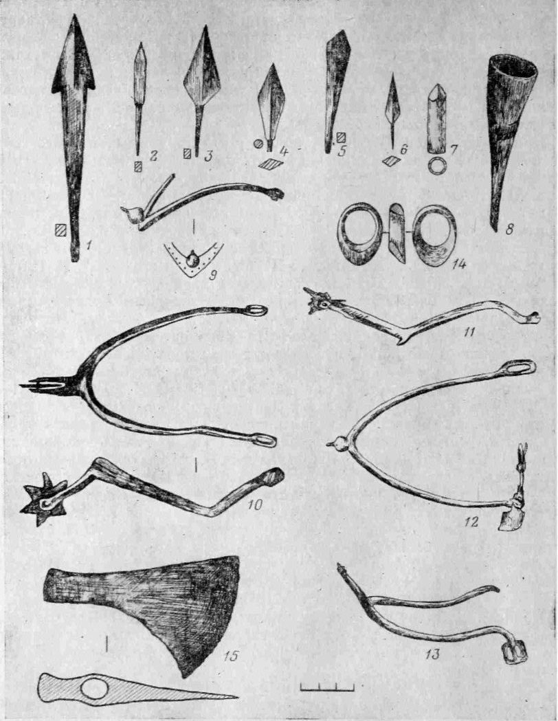 | Рис. 2. Оружие и предметы воинского снаряжения из раскопок в Московском Кремле. 1 — наконечник дротика 2-7 – наконечники стрел; 8 — вток копья; 9-13 — шпоры; 14 —- костяное кольцо; 15 – топор. |