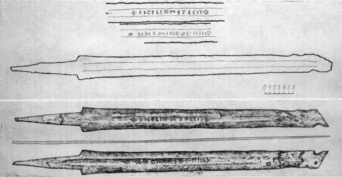 При археологических наблюдениях 1975 г. в южной оконечности Ивановской площади на глубине 7 м от уровня современной мостовой в вязком влажном гумированном слое найден клинок стального меча (рис. 1). Стержень рукояти клиновидной формы. Длина сохранившейся части меча 68,5, ширина лезвия 4, длина стержня рукояти 24,5, ширина у пяты 5,1 см. Металл покрыт рыхлыми окислами синего цвета. Долы, идущие вдоль клинка, занимают по ширине треть лезвия. По классификации мечей второй половины XI-XIII в., предложенной А. Н. Кирпич-никовым, найденный в Кремле экземпляр принадлежит к типу II и представляет собой разновидность клинка с трехчастным бронзовым либо железным полым навершием и трубчатым перекрестием. Меч имеет двухстороннее подписное клеймо, что уточняет его дату — середина XII в. (между 1130-1170 гг.) Надписи на лезвии, выполненные латинскими буквами, расположены вдоль дола и занимают треть верха полосы. На одной стороне меча читается: «[ СI ] CELIN MEFECIT» («Цицелин (?) меня сделал»). Поскольку две первые буквы имени мастера реконструируются неполностью, возможно несколько его разночтений. На другой стороне клинка надпись представляет собой традиционный девиз: «[I]NNOMINEDO(M)INI» («во имя божье»). Обе надписи обрамлены тамгообразными гербовыми знаками — костыльными крестами.