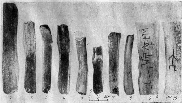 Заключая характеристику лощил, следует отметить, что они были специальными орудиями гончаров, рассчитанными на определенные операции, связанные с орнаментацией столовой посуды. Сработанность рабочих поверхностей указывает на долговременность пользования ими. Мастер специально обтачивал и закруглял острые края кости с тем, чтобы инструментом было удобнее пользоваться. Нельзя также не отметить, что орудия, видимо, «имели хозяина». Об этом свидетельствуют лощила с процарапанными линиями, напоминающими тамгообразные знаки и рунические буквы (рис. 1, 9, 10). Убедительным подтверждением сказанному выше относительно назначения лощил могут служить условия находок их на памятниках салтово-маяцкой культуры Среднего Донца.