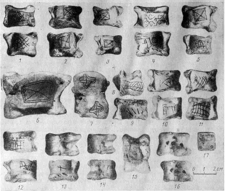 VI. Шестая категория изделий из кости – игрушки: бабки, биты, игральная кость. Бабки (62 экз. рис. 7, 1-12). Сделаны из овечьих астрагалов. Большая часть их имеет рисунок, остальные отполированы. Тип первый – с рисунком (44 экз.). Бабки с прорисовками сетки, тамгообразных знаков, стилизованных животных, штриховых рисунков, геометрических фигур. Наиболее часто встречается изображение квадрата или прямоугольника с двумя перекрещивающимися линиями (рис. 7, 3). Несмотря на то что сюжеты рисунков повторяются, в каждом видна индивидуальная рука исполнителя. В одном случае рисунки аккуратные, сложные и по сюжету, и по композиции (рис. 7, 4), в другом случае они выполнены небрежно, как бы наспех (рис. 7, 9-12).