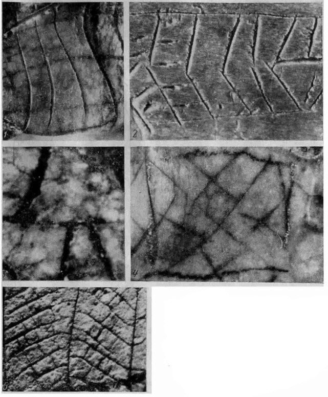 Рис. 8. Макросъемка деталей рисунков на кости. 7, 2 – техника холодного прочерчивания, 3, 4 – техника горячего прочерчивания, 5 – фрагмент рисунка на таранной кости (увел.,в 10 раз)