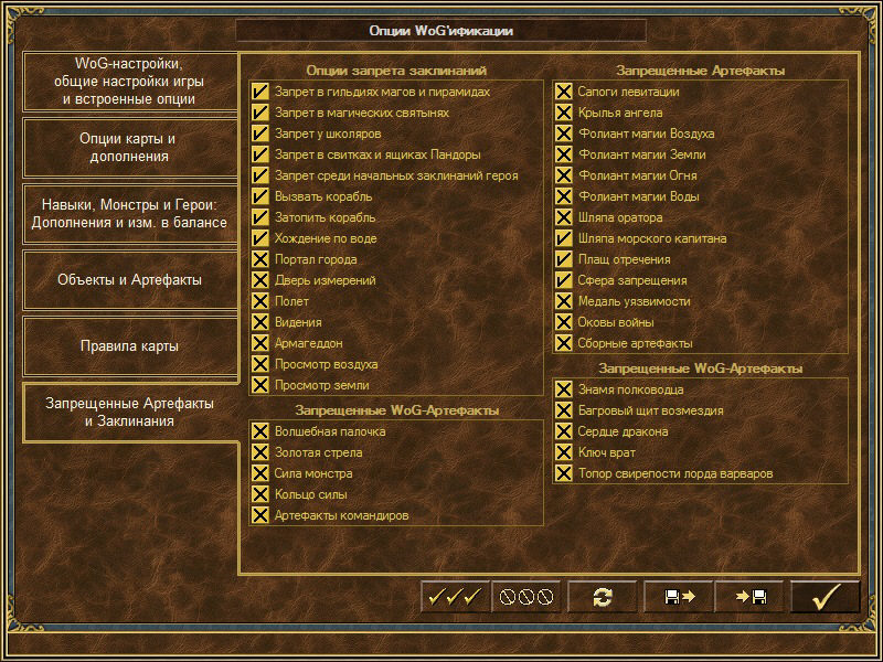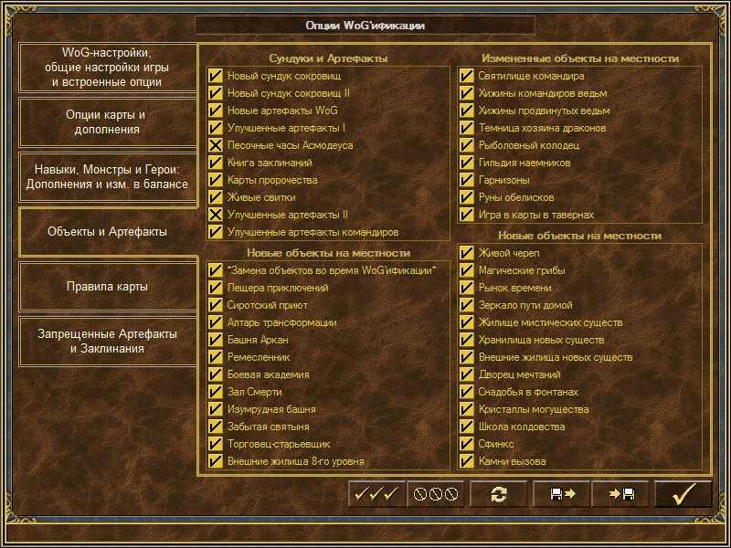 На вкладке "Объекты и Артефакты" в параграфе "Сундуки и Артефакты" должны быть проставлены все галочки. Я не ставил галочки напротив "Песочные часы Асмодеуса" и "Улучшенные Артефакты II" потому что они мне не нужны, но вам могут пригодиться. На вкладке  "Запрещенные Артефакты и Заклинания" в параграфе "Запрещенные WoG-Артефакты" не должно быть галочек. У меня там галок нету.