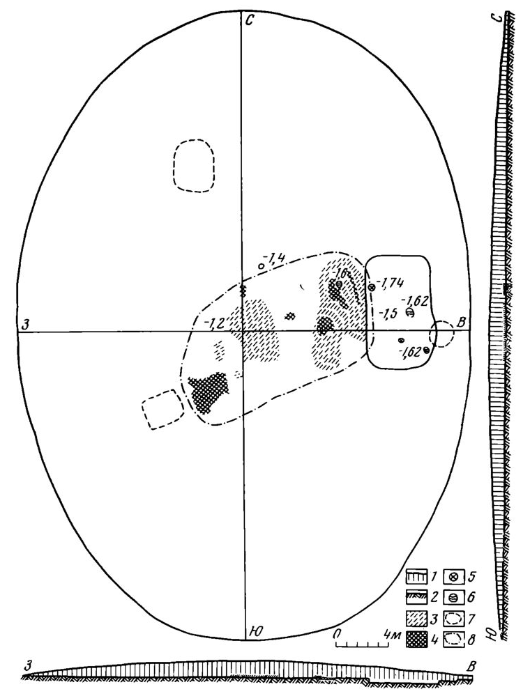 Рис. 1. План и профиля кургана у с. Братово. 1 — насыпь: 2 — материк; 3 — скопление угля; 4 — прожженные участки; 5 — урна; 6 — захоронение в ямке; 7 — шурфы кладоискателей; 8 — границы кострища