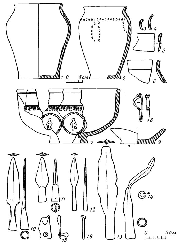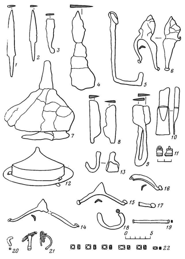 Между двумя урнами, чуть к востоку, находилась овальная в плане ямка размером 0,7х0,5 и глубиной 0,12 м. Тщательно перебранные кальцинированные кости, помещенные в ней, сверху были прикрыты грудой сильно корродированных вещей, в числе которых: 1) деформированный умбон с цилиндрической центральной частью, конически сужающейся к высокой верхушке; высота умбона 12 см (рис. 5, 7); 2) фрагмент рукоятки щита с трапециевидным концом и двумя параллельными ободками по ее краю (рис. 5, 10); 3) изогнутый наконечник копья с листовидным пером; длина наконечника 23, диаметр втулки 2 см (рис. 2, 13); 4) две пары пружинных ножниц с обломанными лезвиями (рис. 5, 8, 9, 13); 5) ножевидной формы предмет с изогнутой рукояткой и обломанным концом (рис. 5, 3); 6) фрагменты двух пар шпор с асимметричными дужками и крючками под шипами; дужки на концах имеют полукруглые шишечки, в сечении трехгранные (рис. 5, 6, 14-17); 7) ключ крючковидной формы с кольцом на конце ручки. Изготовлен из круглого в сечении железного прута; длина ключа 15,5 см (рис. 5. 5); 8) часть железной арбалетовидной фибулы с головной кнопкой и сломаной ножкой (рис. 5, 21); 9) фрагмент бронзовой поделки, круглой в сечении (рис. 5, 18).