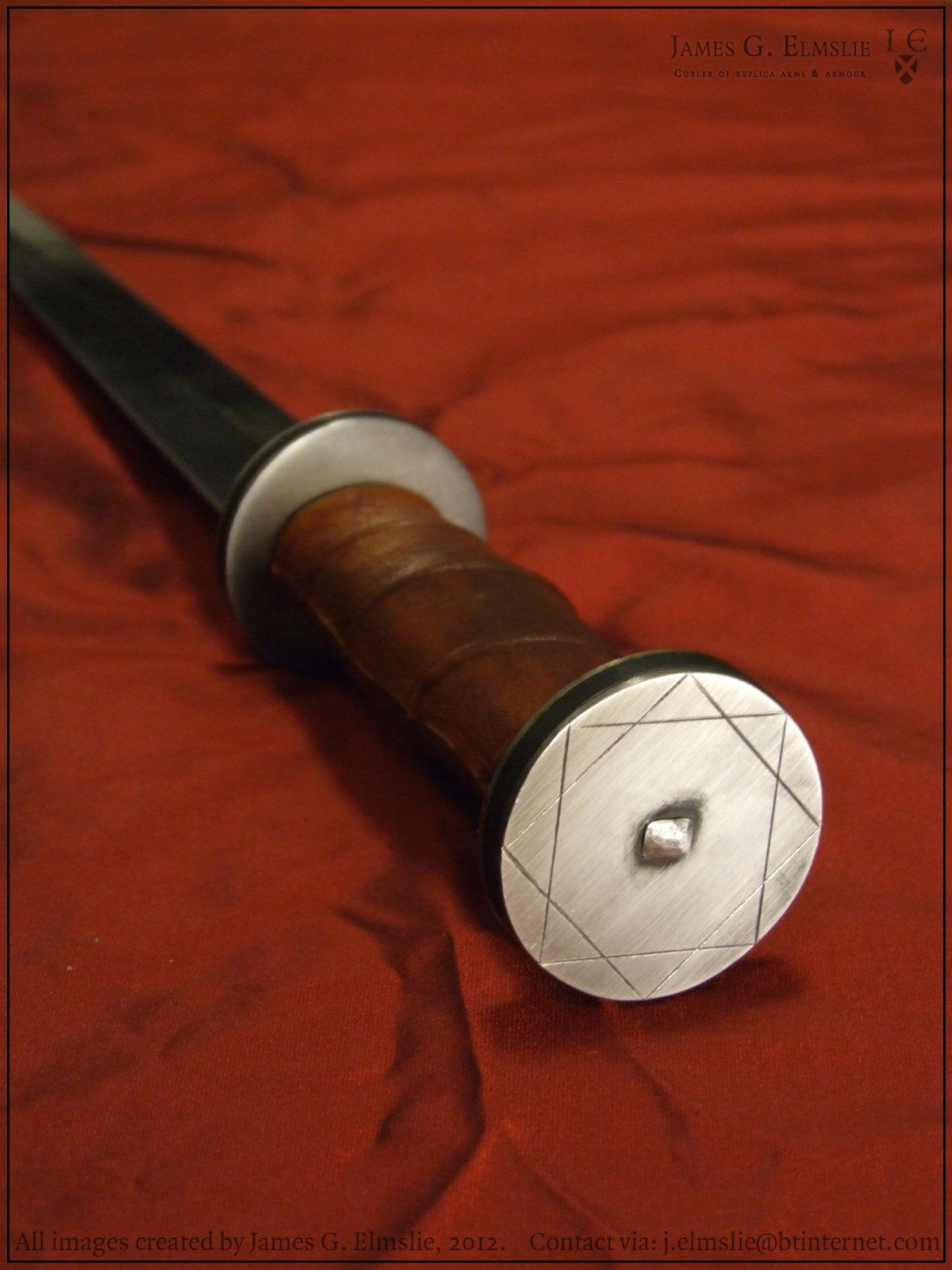 Клинок выкован из стали EN45. Покрытие ножен, ременная первязь и черен рукояти из натуральной кожи. Пряжки, крестовина, навершие – бронзовые. Навершие рукояти типа J1 украшено гербом в виде птички.