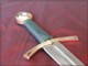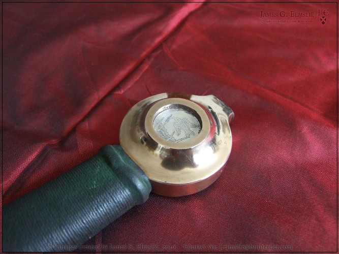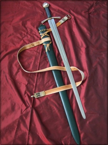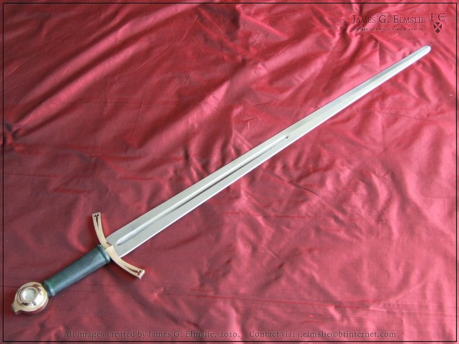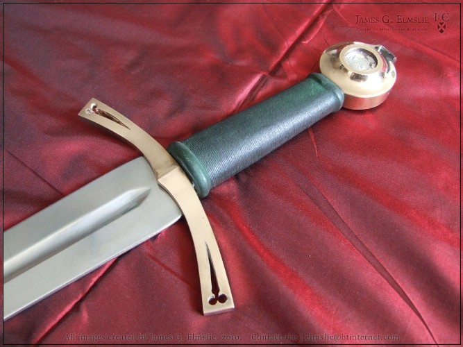 Клинок выкован из стали EN45. Покрытие ножен, ременная первязь и черен рукояти из натуральной кожи. Пряжки, крестовина, навершие – бронзовые. Навершие рукояти типа J1 украшено гербом в виде птички.