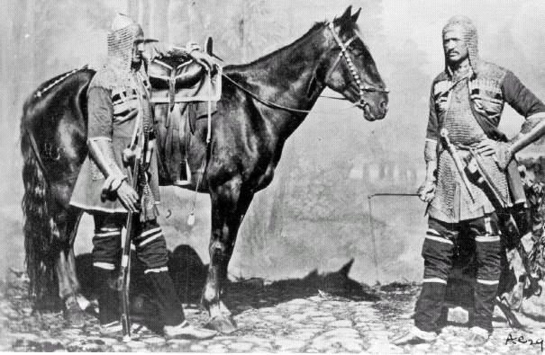 Фотография рубежа XIX/XX вв, изображающая двух Кабардинцев (Къэбэрдей – страна в Восточной Черкесии) с конем Кабардинской породы (Адыгэш) в старинной экипировке Кабардинских аристократов. Куртки поверх доспехов должны быть красного цвета. Если бы перед нами были Пщы (Князья/Принцы/Герцоги/Лорды), то обувь была бы красная, если уорки (рыцари/уздени/дворяне) то желтая. Ружья только нарезные – гладкоствольные с круглой свинцовой пулей были бессполезны против панциря (кольчуги) Кабардинской работы, поэтому уже в XVIII в в Черкесии изготавливали только кремневые винтовки.